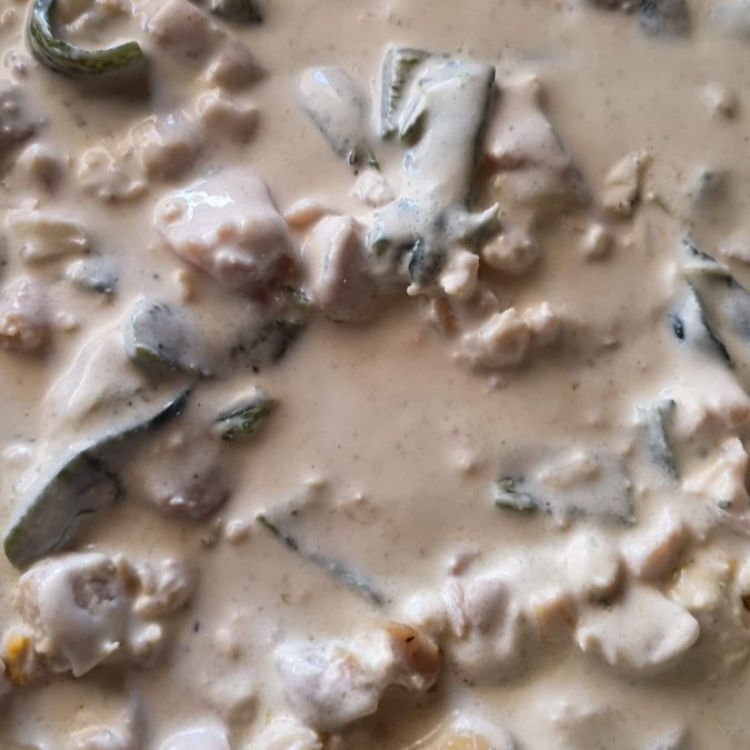 Tiras de pollo combinadas con rajas de chile poblano en una suave salsa de crema. Servido con arroz, frijol y tortillas de maíz.