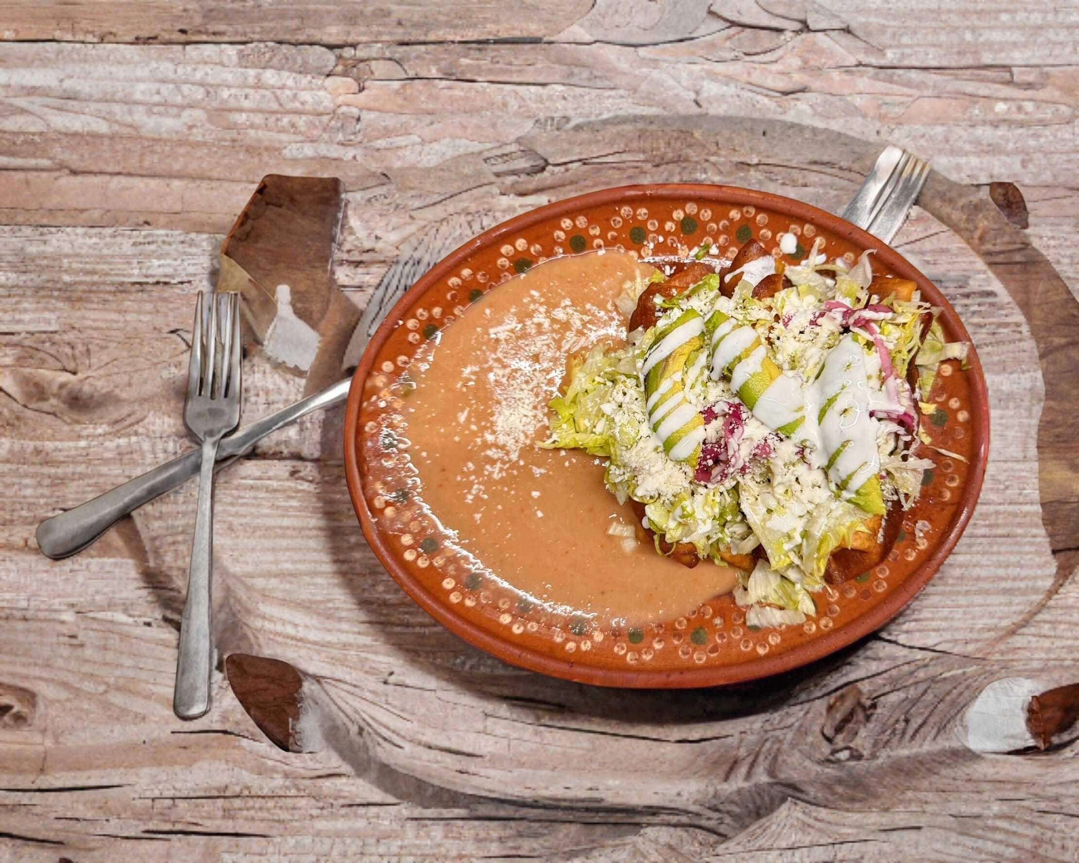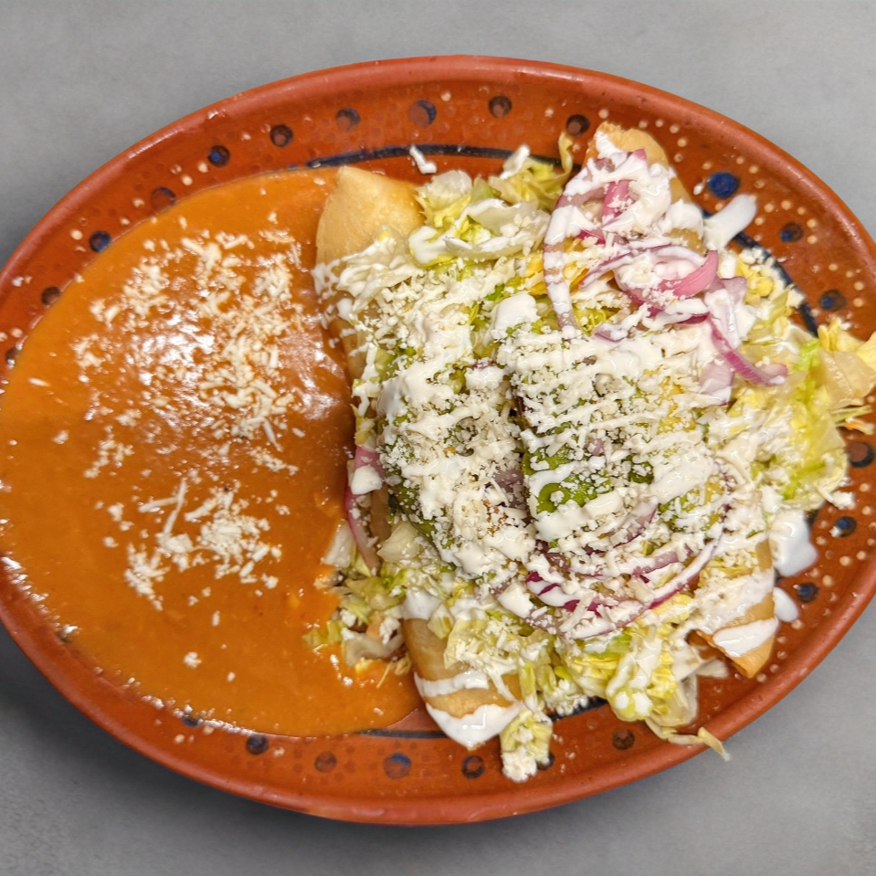 Orden de 3 Chimichangas rellenas de carne o carne con queso, con queso, crema, lechuga y cebolla morada, acompañados de frijoles y consome de tomate 8oz