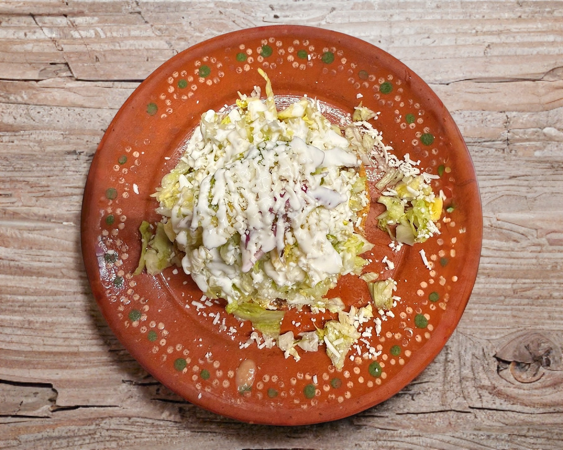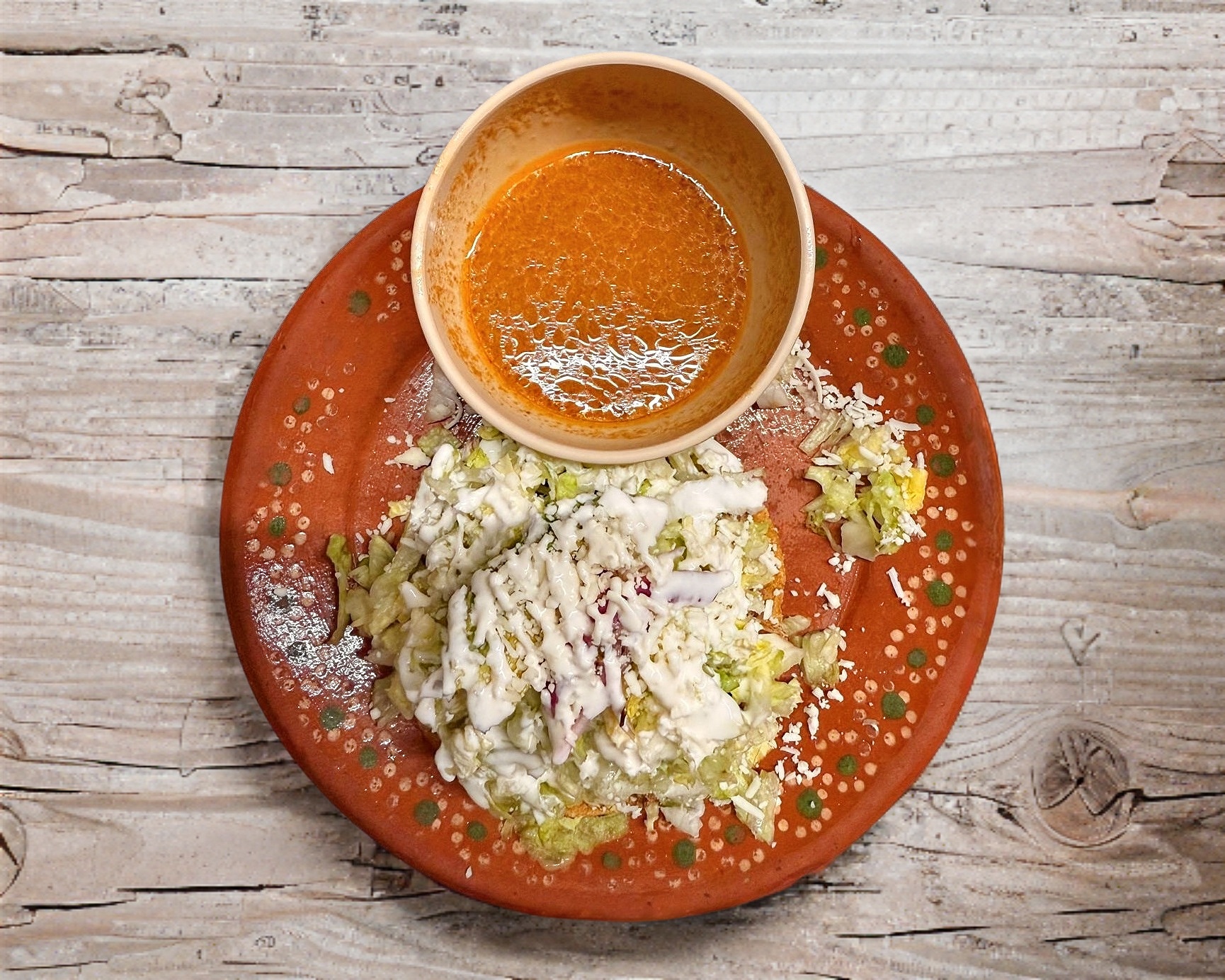 1 pieza de tostadas crujientes de pollo, papa o carne, con lechuga, crema, queso, cebolla morada y consome de tomate 8oz