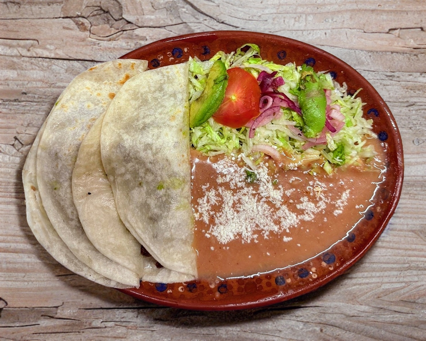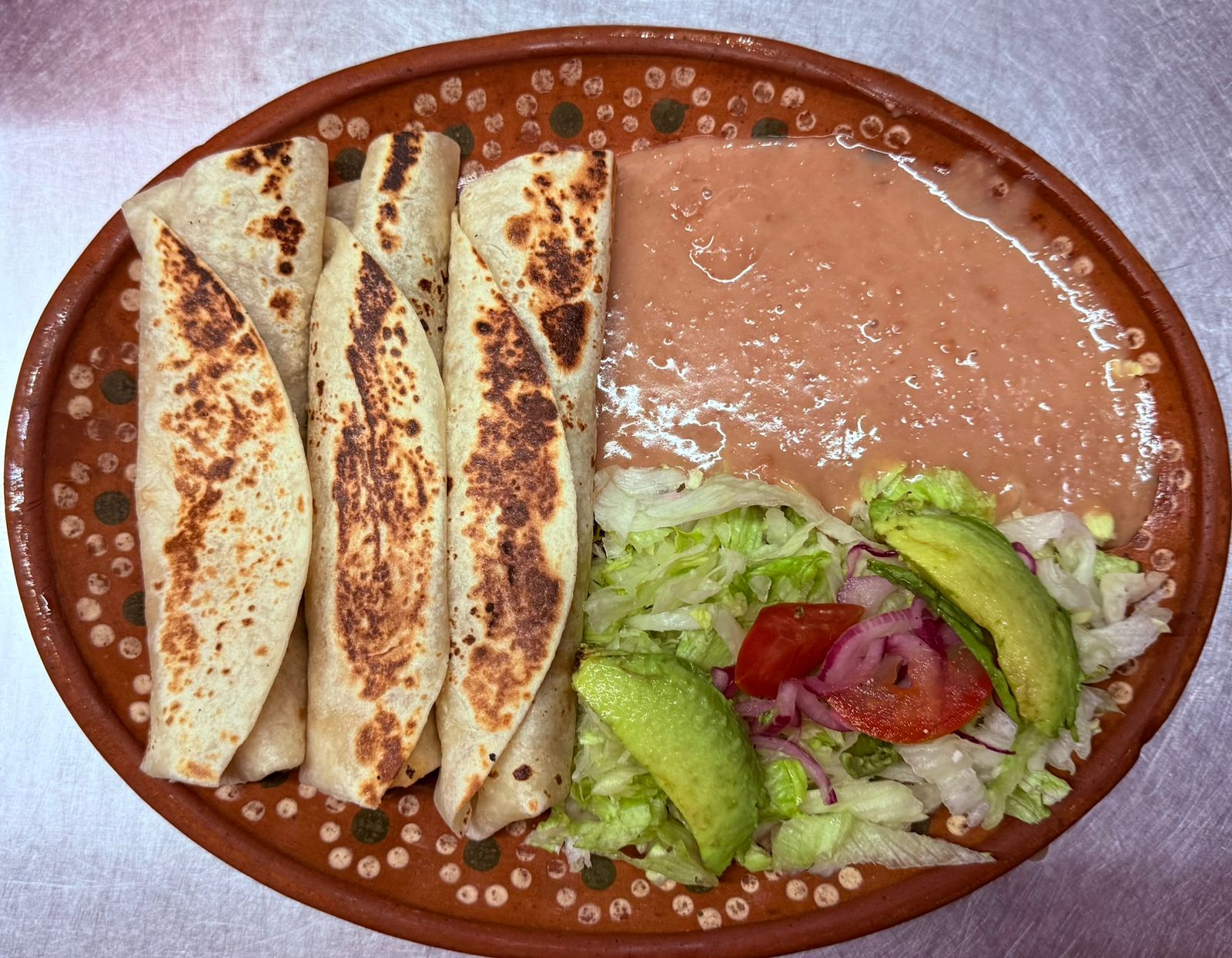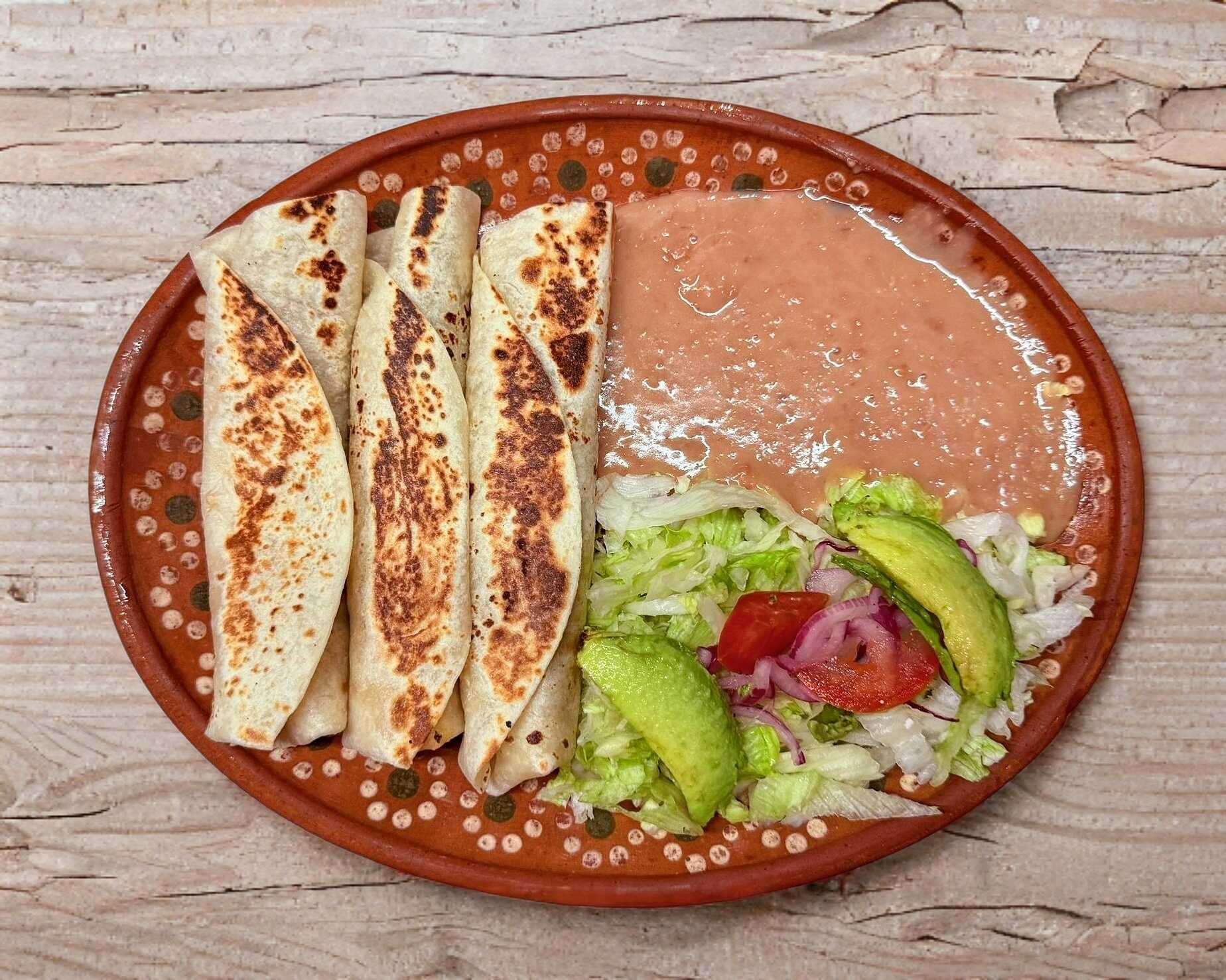 3 quesadillas de queso de harina con 2 guarniciones a elegir (frijol, ensalada, arroz o papas fritas),