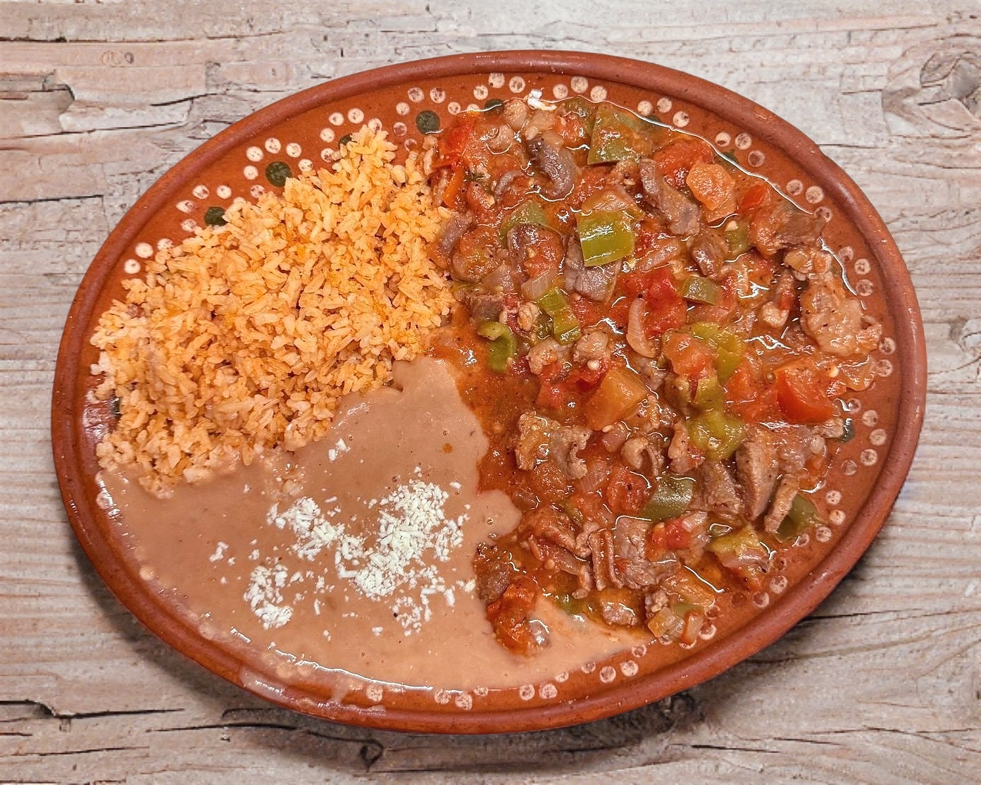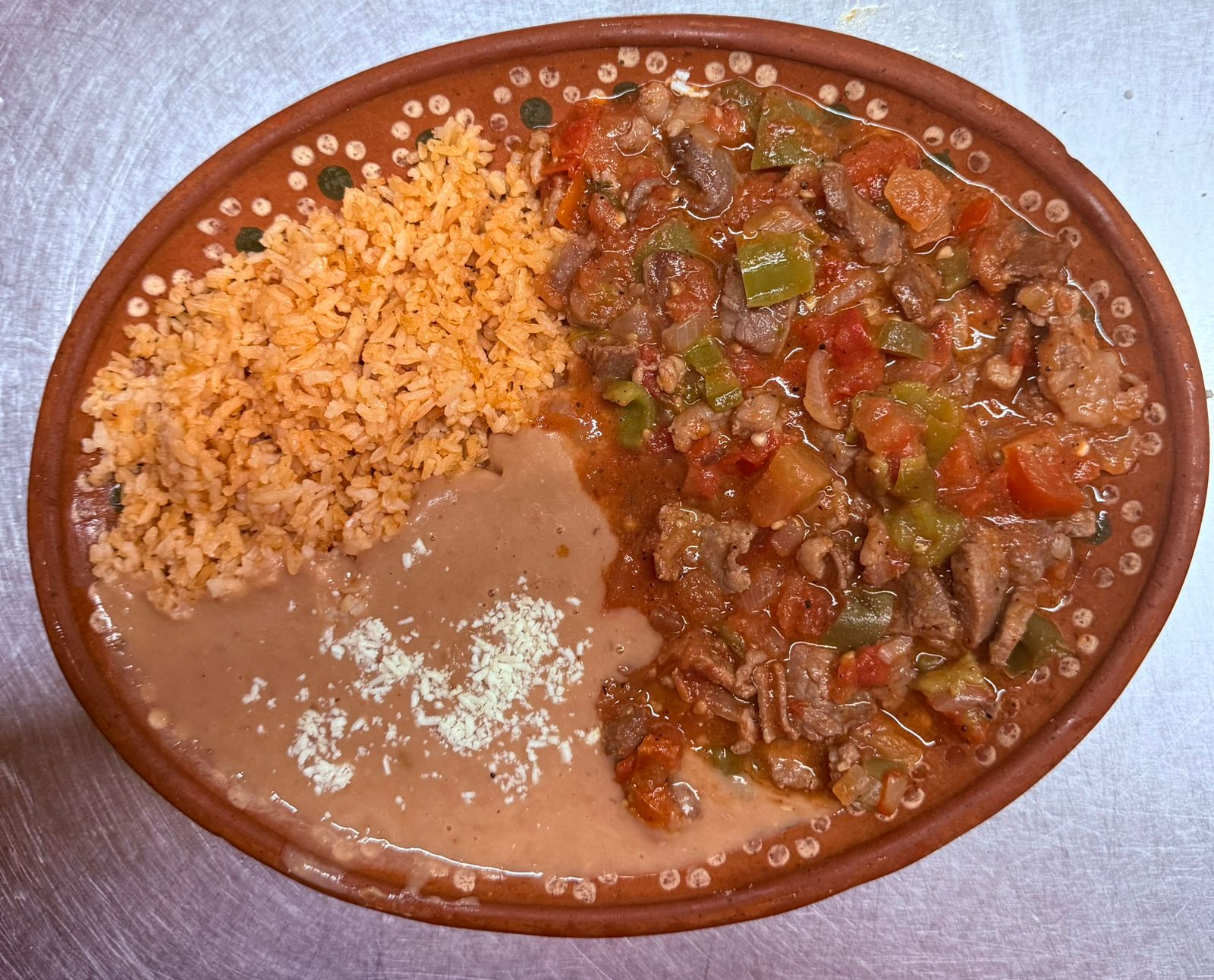 Bistec Ranchero con 2 guarniciones a elegir (frijol, ensalada, arroz o papas fritas), incluye tortillas de harina o maíz