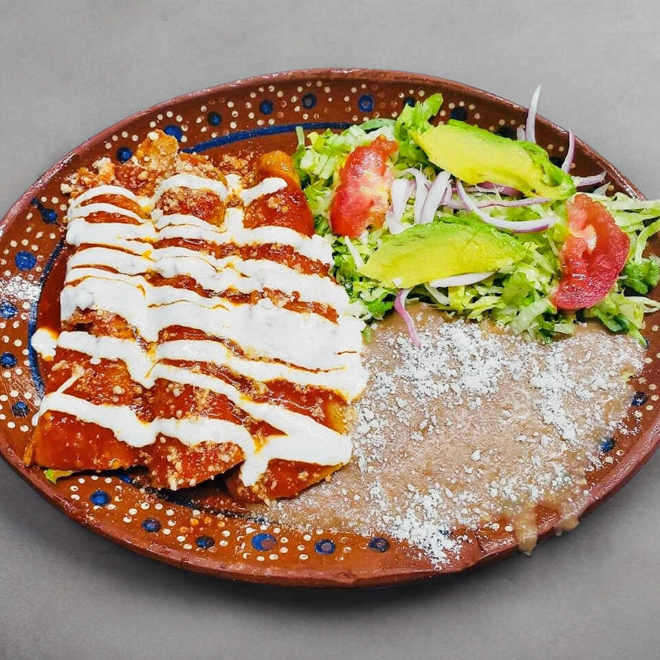 3 Enchiladas Rojas o verdes a elegir relleno, con 2 guarniciones a elegir (frijol, ensalada, arroz o papas fritas), incluye tortillas de harina o maíz