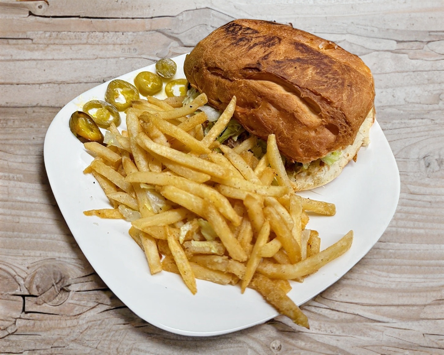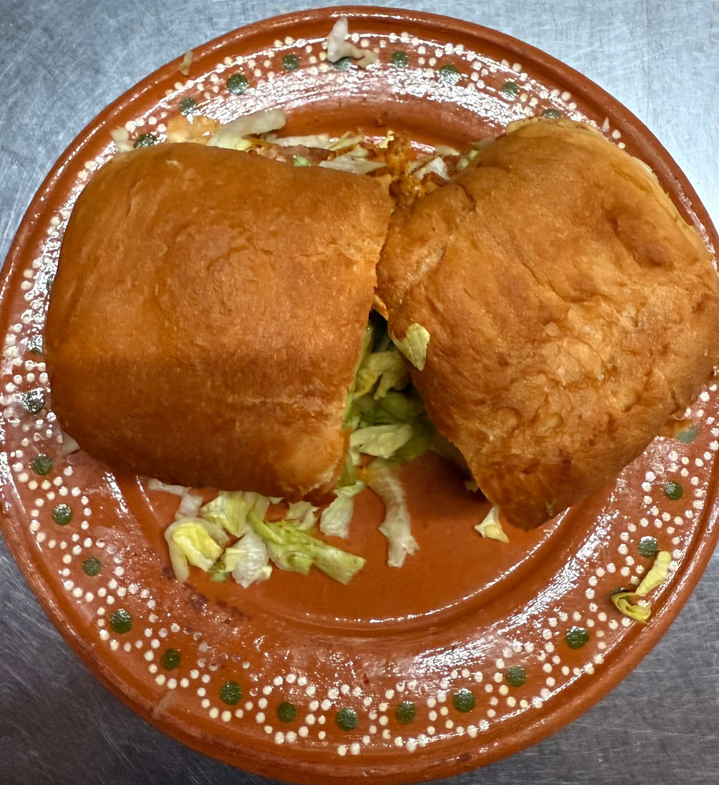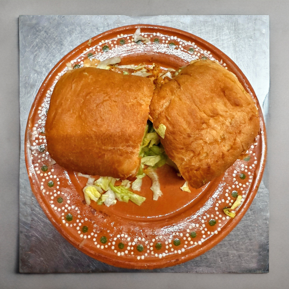 Torta de Machaca con lechuga, tomate, frijol, mantequilla y mayonesa