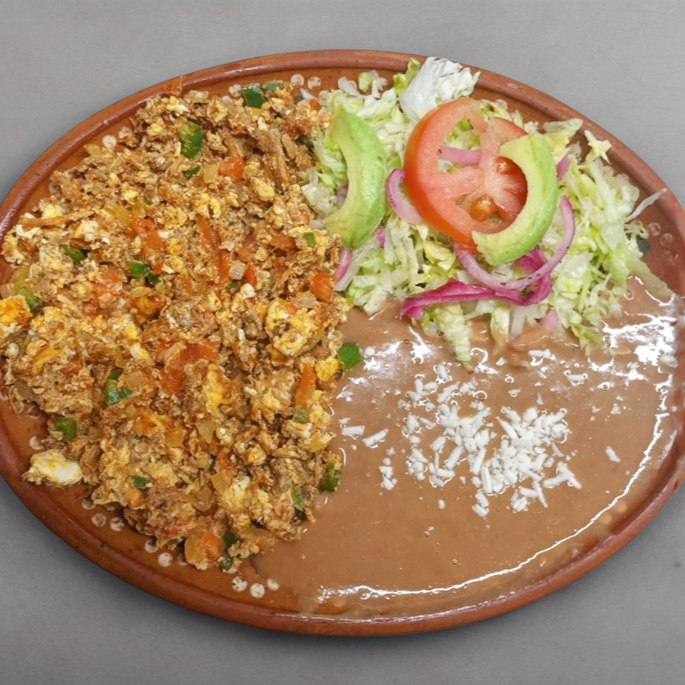 Huevos con machaca deshebrada con 2 guarniciones a elegir (frijol, ensalada, arroz o papas fritas), incluye tortillas de harina o maíz