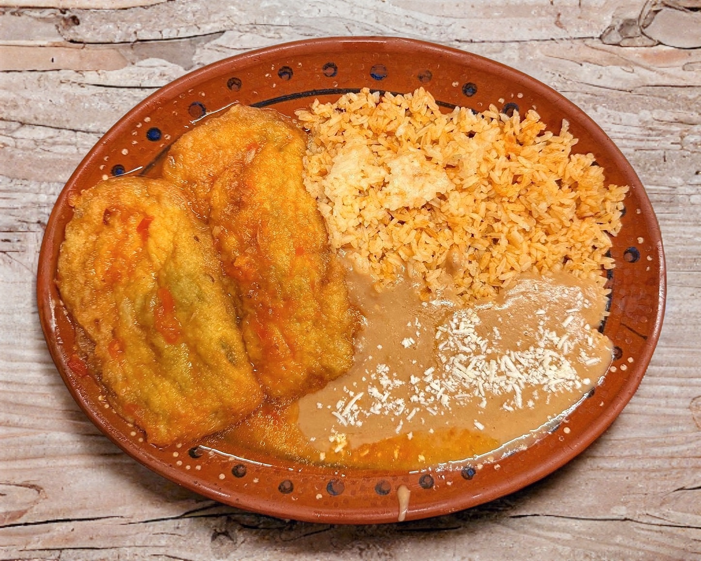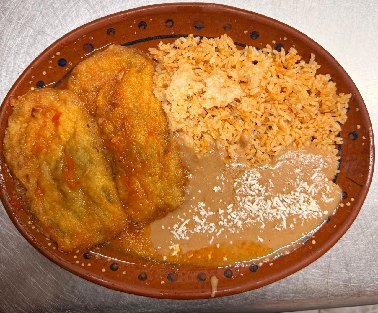 2 piezas de chiles rellenos capeados con huevo con 2 guarniciones a elegir (frijol, ensalada, arroz o papas fritas), incluye tortillas de harina o maíz