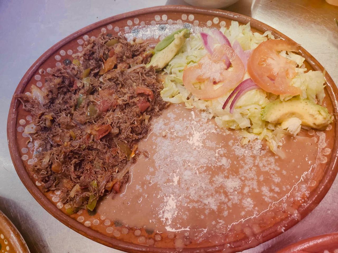 Orden de Machaca deshebrada con 2 guarniciones a elegir (frijol, ensalada, arroz o papas fritas), incluye tortillas de harina o maízdesebrada con frijol y ensalada incluye tortillas