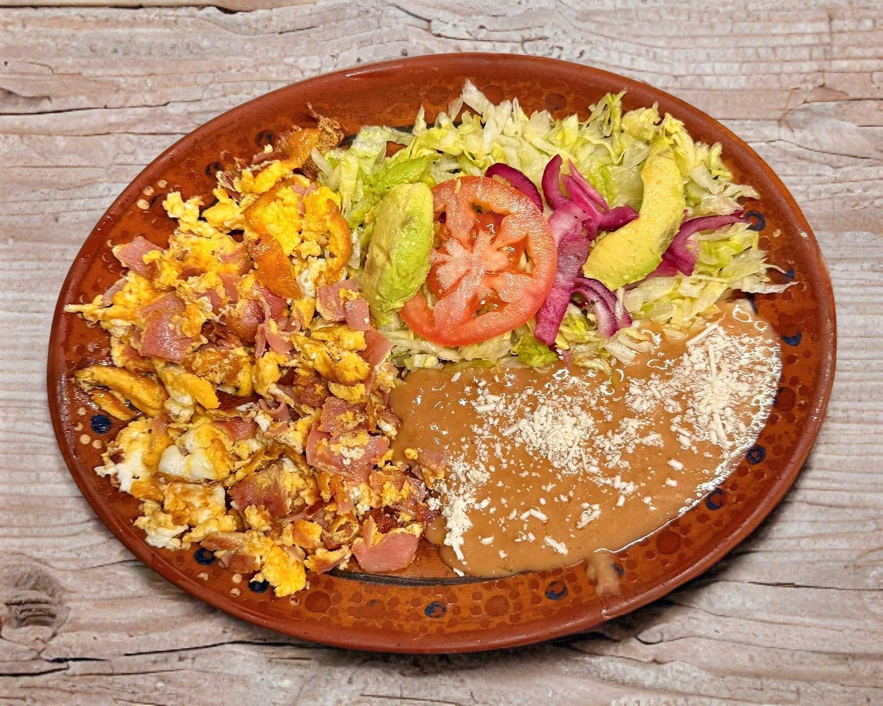 Huevos con jamón acompañados con 2 guarniciones a elegir (frijol, ensalada, arroz o papas fritas), incluye tortillas de harina o maíz