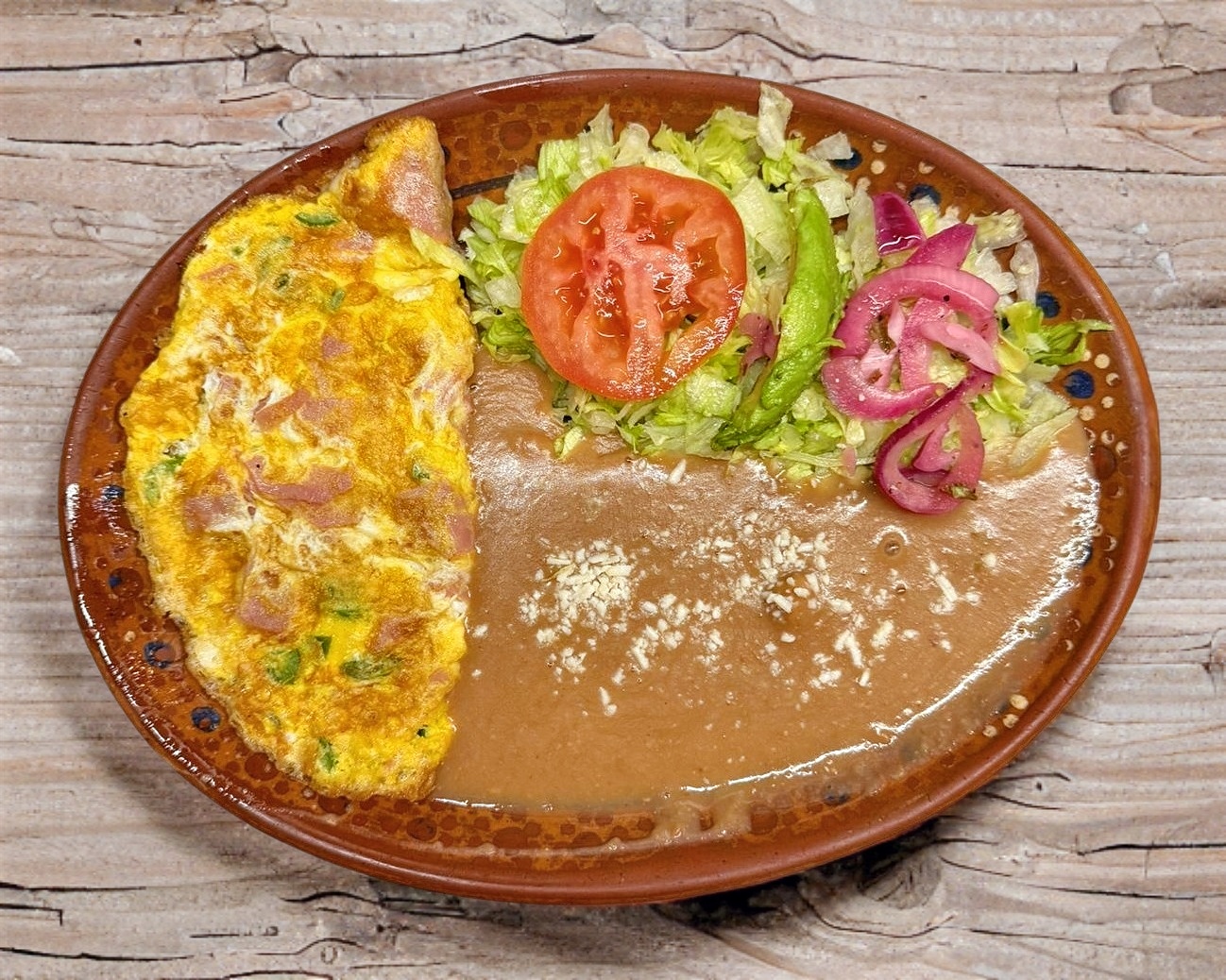Omelette de huevo con jamón y queso con 2 guarniciones a elegir (frijol, ensalada, arroz o papas fritas), incluye tortillas de harina o maíz