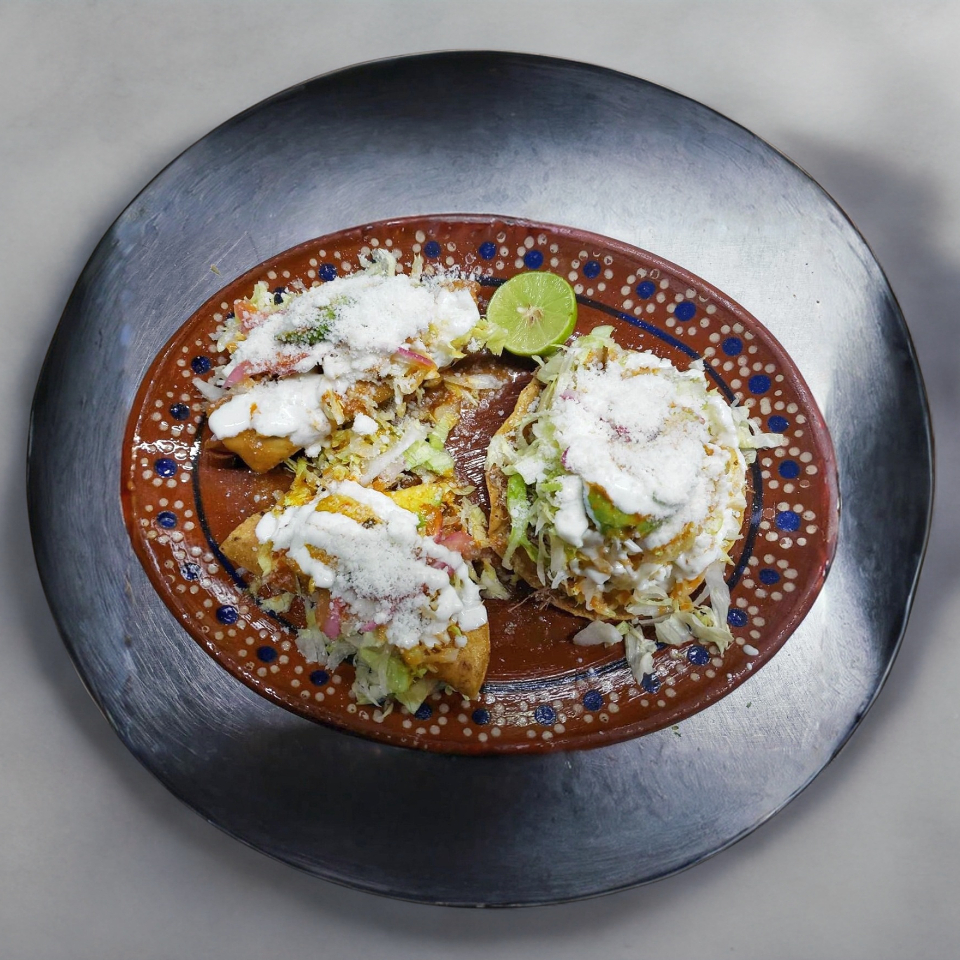 Flautas doradas de carne deshebrada, con queso, crema, lechuga y cebolla morada, acompañados de consome de tomate 8oz