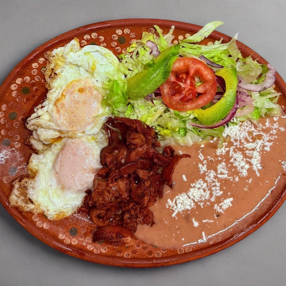 Huevos estrellados acompañados con crujiente tocino con 2 guarniciones a elegir (frijol, ensalada, arroz o papas fritas), incluye tortillas de harina o maíz