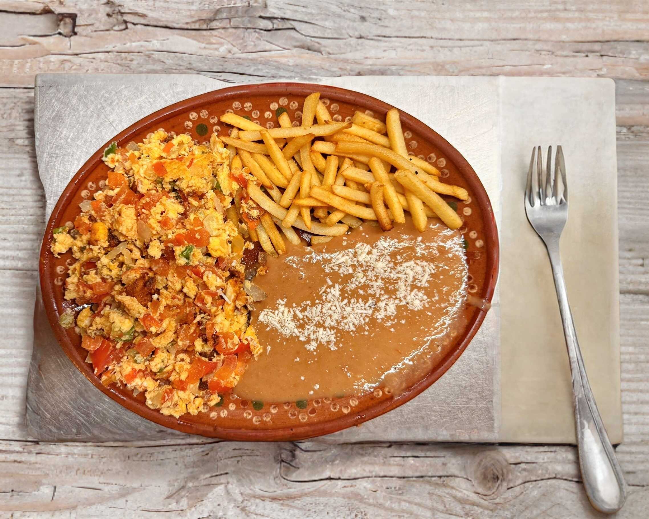Huevos con verdura acompañados con 2 guarniciones a elegir (frijol, ensalada, arroz o papas fritas), incluye tortillas de harina o maíz