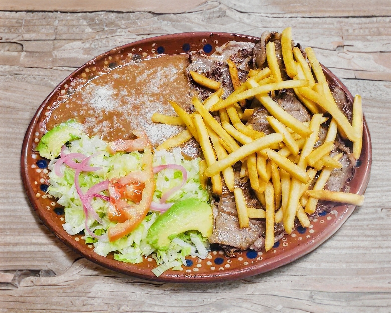 Fajitas de res con 2 guarniciones a elegir (frijol, ensalada, arroz o papas fritas), incluye tortillas de harina o maíz