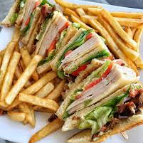 club sandwich, pollo,jamon,queso amarillo,mayonesa,cebolla,aguacate ,acompañado con papas.
