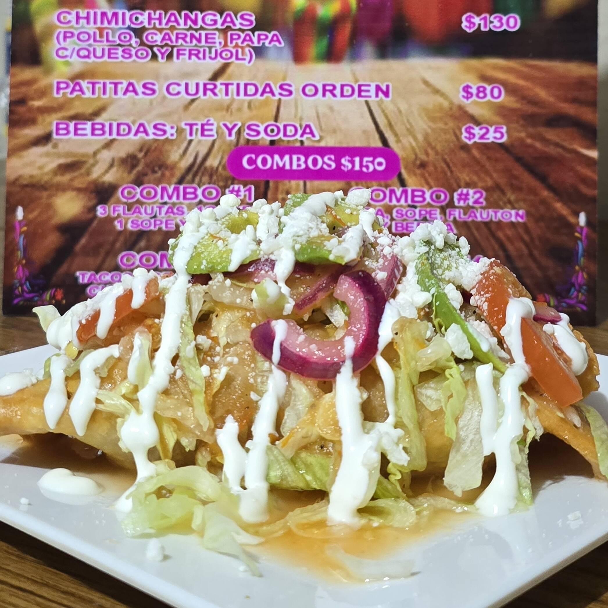 taco de papa con carne, lechuga, crema, queso, aguacate, tomate, cebolla curtida, limon, consome,salsa picosa.