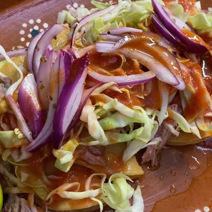 sopes de carne o pollo, crema, queso, aguacate, lechuga, tomate, salsas.