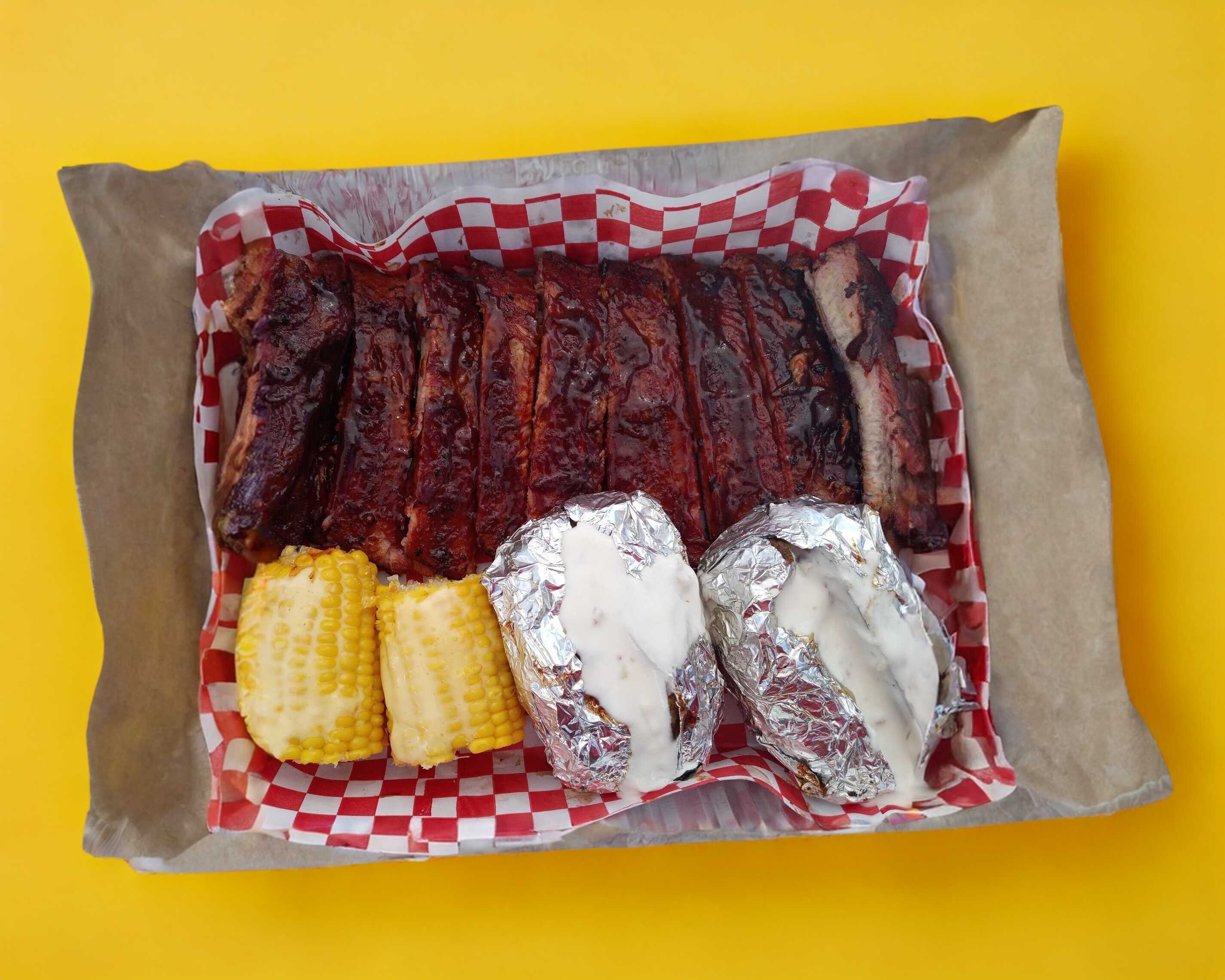 🔥🍖 5 Costillas Ahumadas con Leña de Mezquite 🍖🔥 Preparadas con esmero, nuestras costillas son marinadas durante 12 horas y ahumadas lentamente por 5 horas con leña de mezquite. El resultado es una explosión de sabor ahumado que se deshace en tu boca, ¡una experiencia que deleitará tus sentidos! 🥔🥓🌽 Acompañadas de Papa Horneada y Elote Amarillo Ahumado