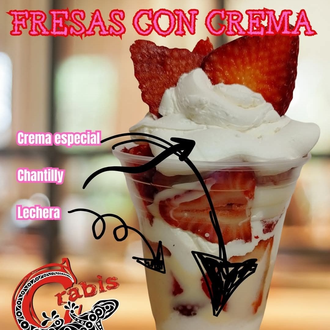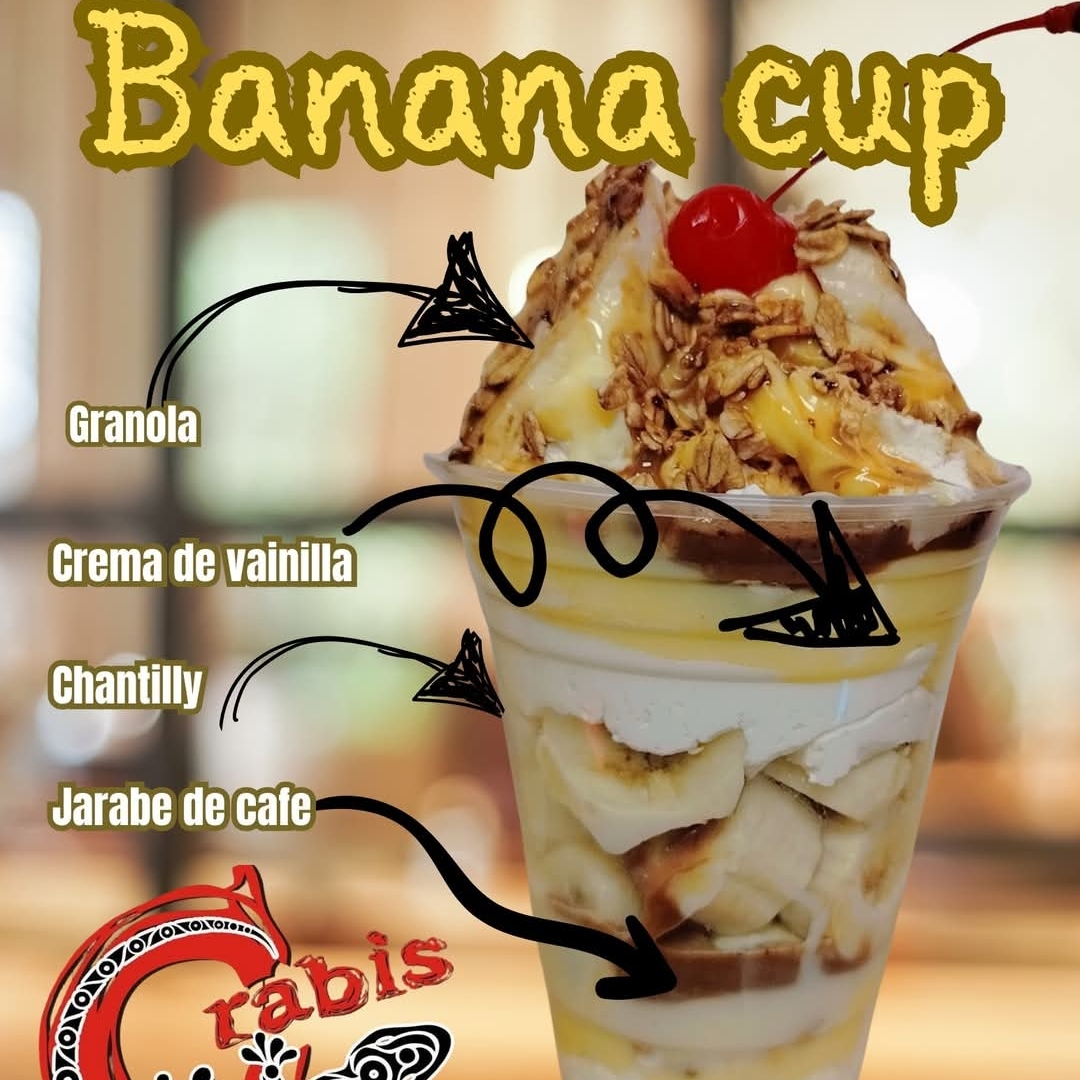 Plátano batido en crema especial acompañado de crema de vainilla, granola, jarabe de café y Chantilly