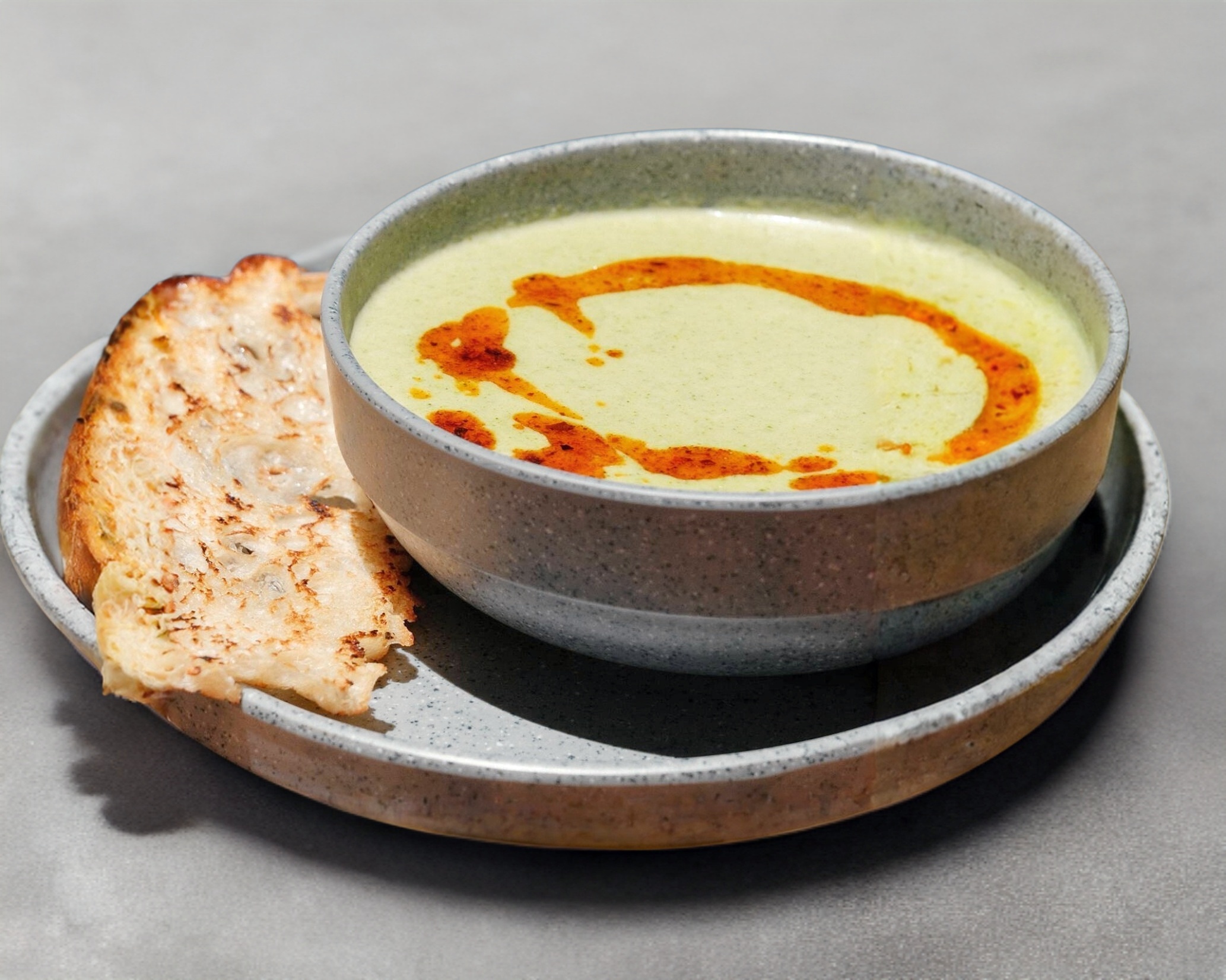 Sopa cremosa con brócoli salteado y un toque de ajo.