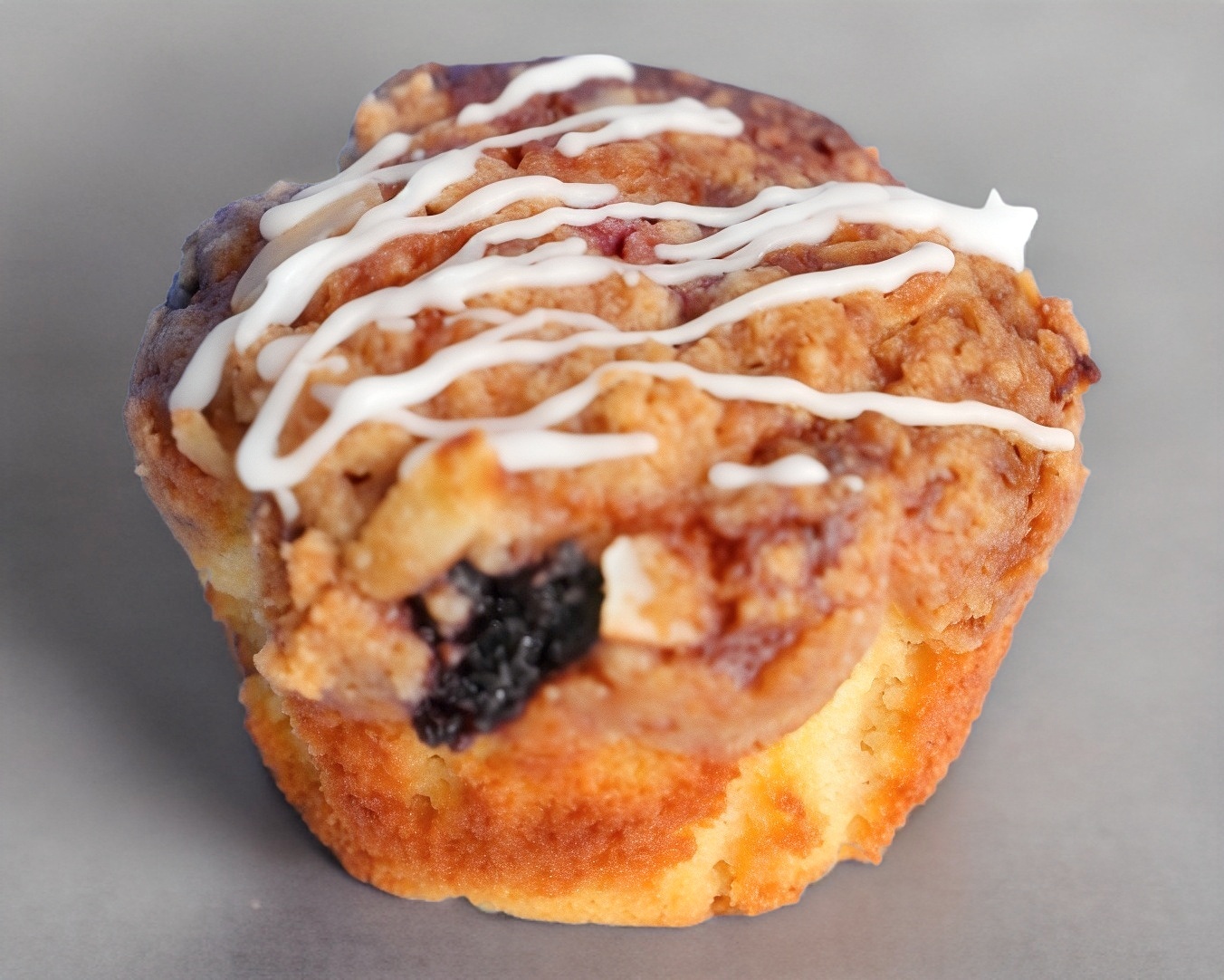 Masa de bizcocho preparada con yogurt griego, aceite de olivo, harina de almendras y frutos rojos, cubierta de streusel de almendra y glaseado.