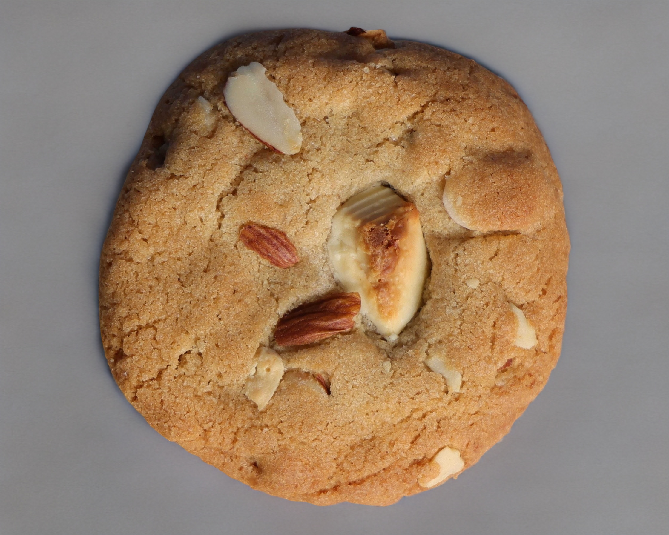 Galleta de mantequilla con trozos de chocolate blanco y almendras tostadas.