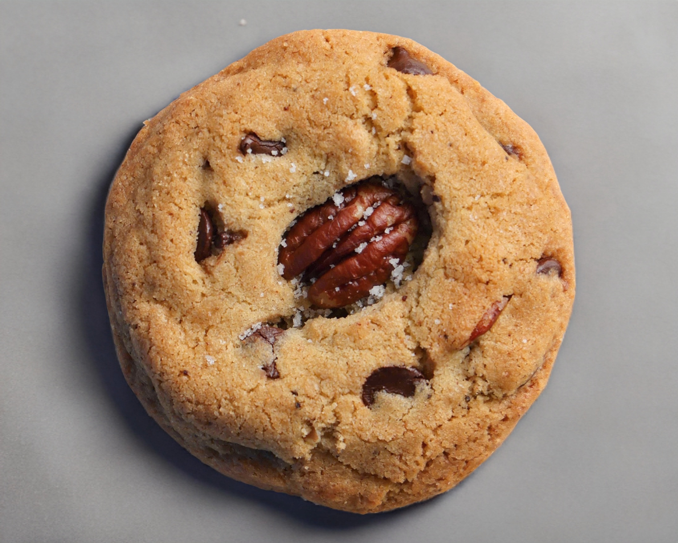 Galleta de mantequilla tostada con trozos de chocolate semi amargo y nueces pecanas, espolvoreada con sal de mar.