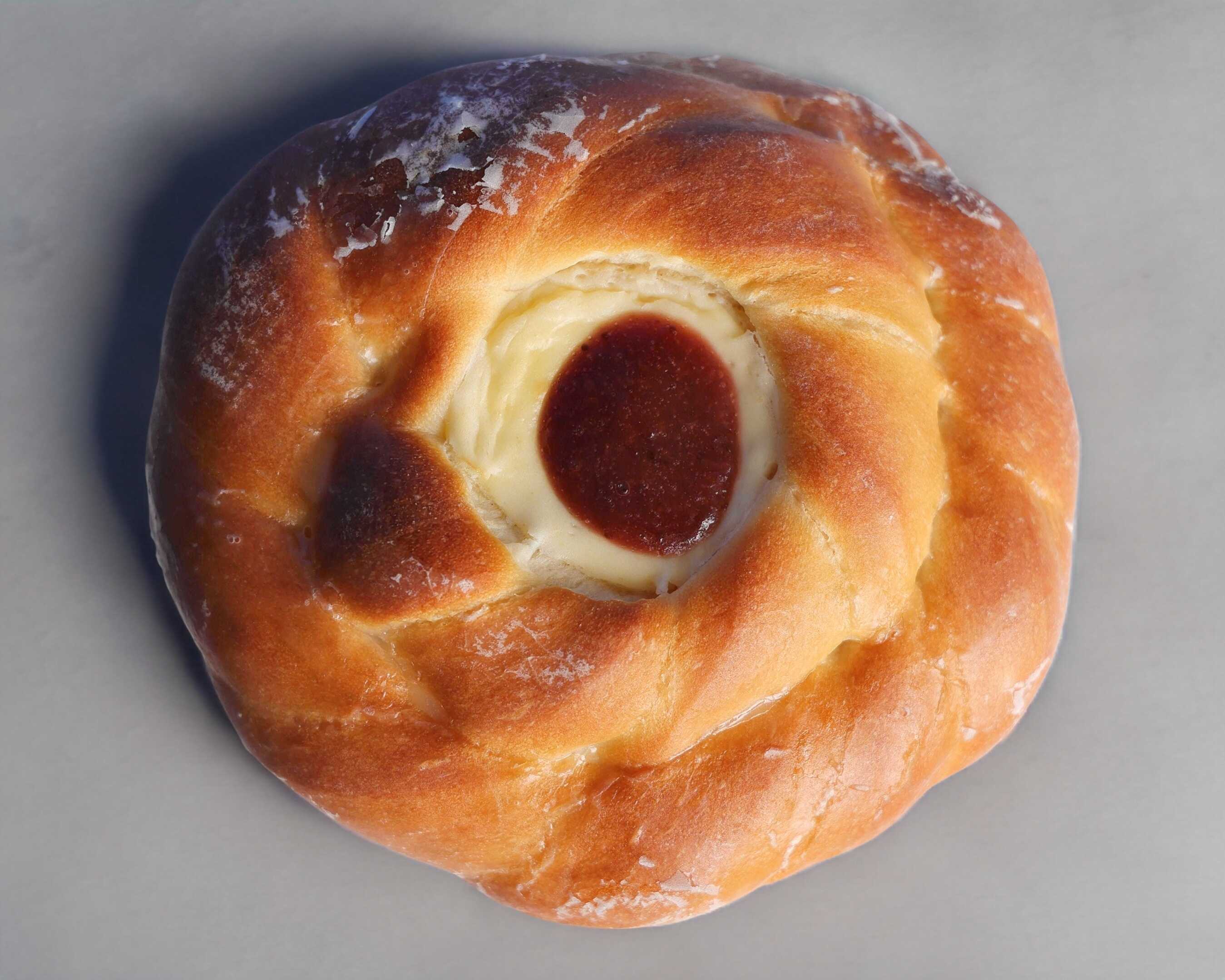 Masa suave base mantequilla, glaseada y rellena de queso con mermelada de fruta de temporada.