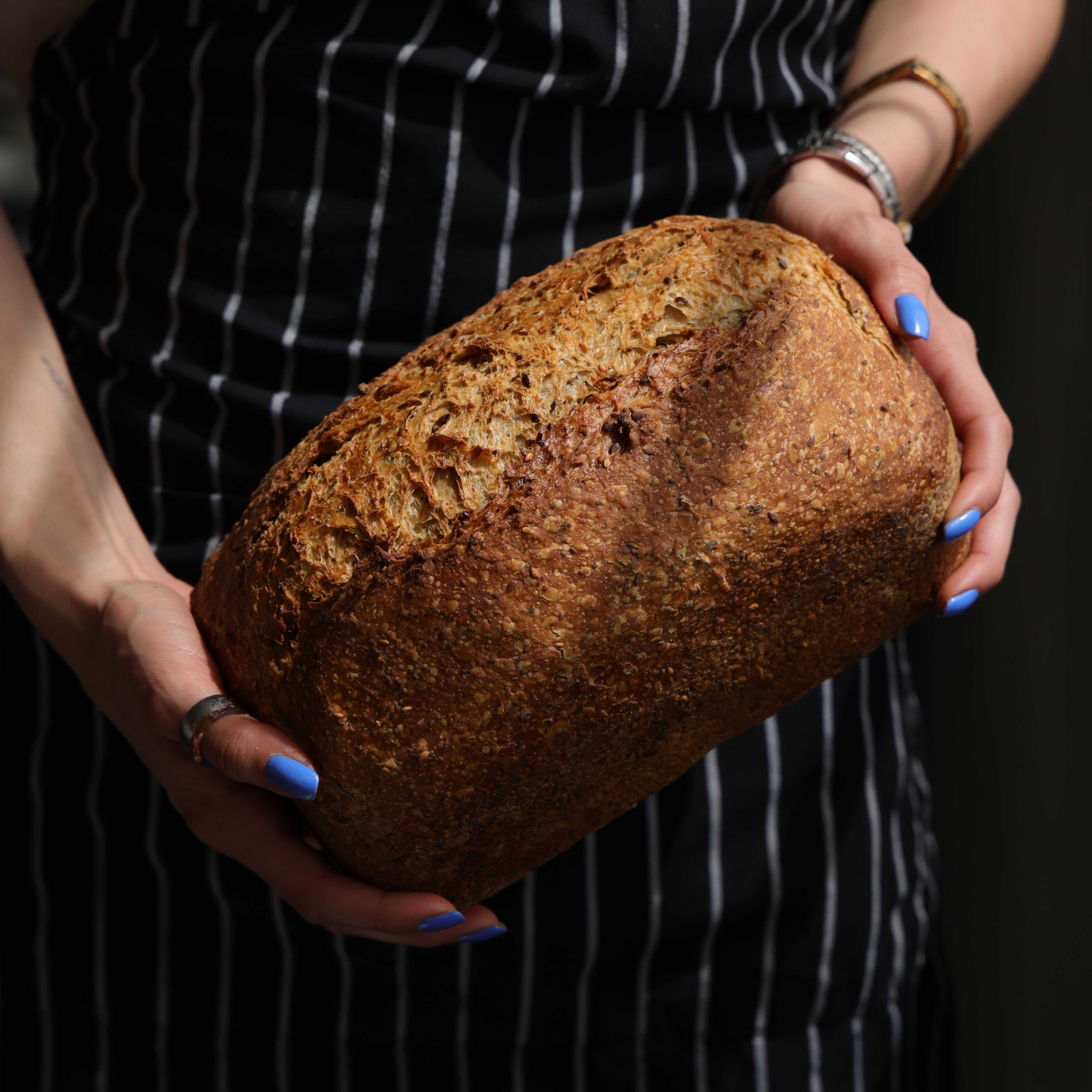 Masa con harinas integrales 100% masa madre, ajonjolí, avena, chía y linaza, con y sin arándano deshidratado.