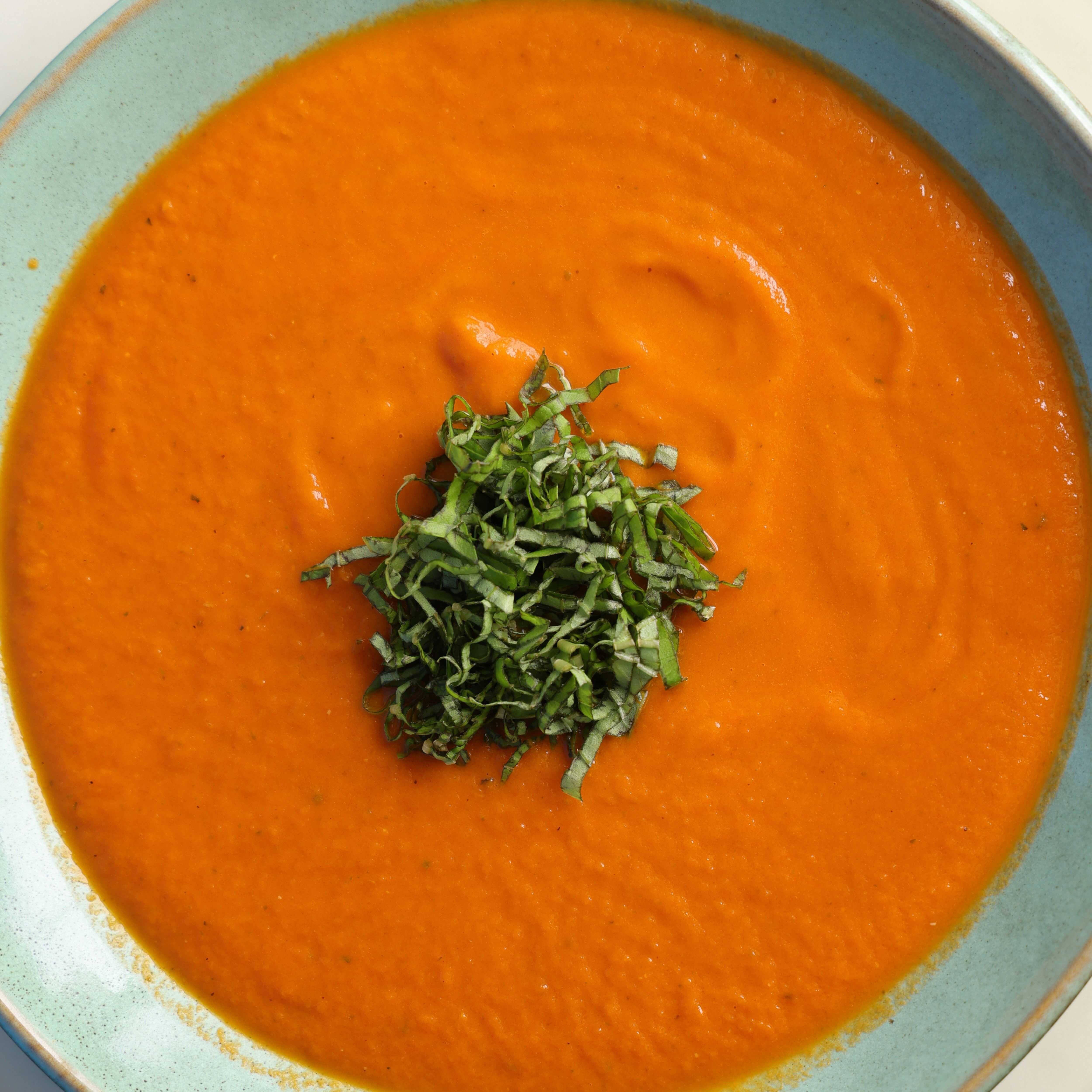 Crema de tomates asados al horno con hierbas frescas.