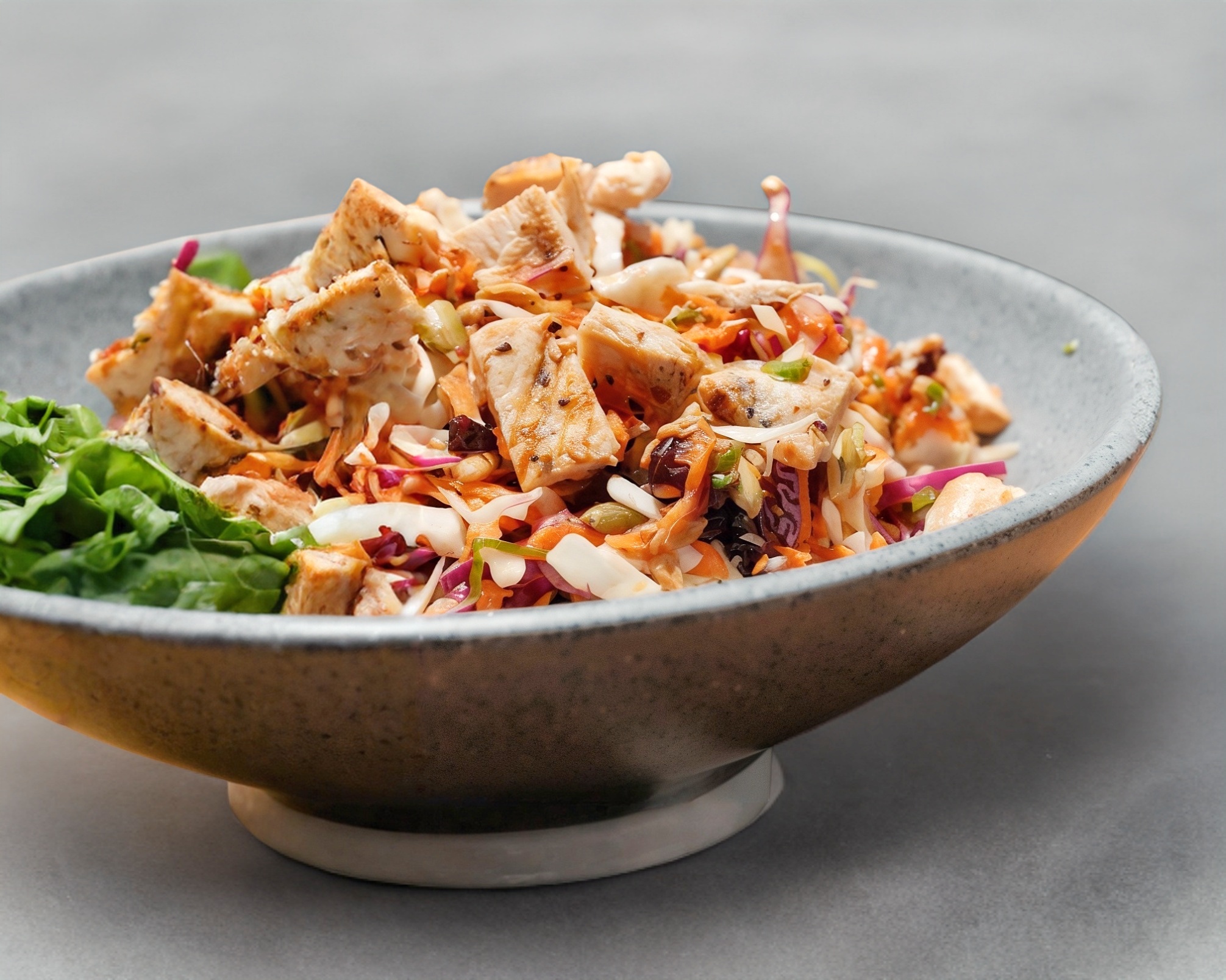 Col rallada, zanahoria, pollo asado, cacahuates, ajonjolí y semillas de girasol con aderezo thai.