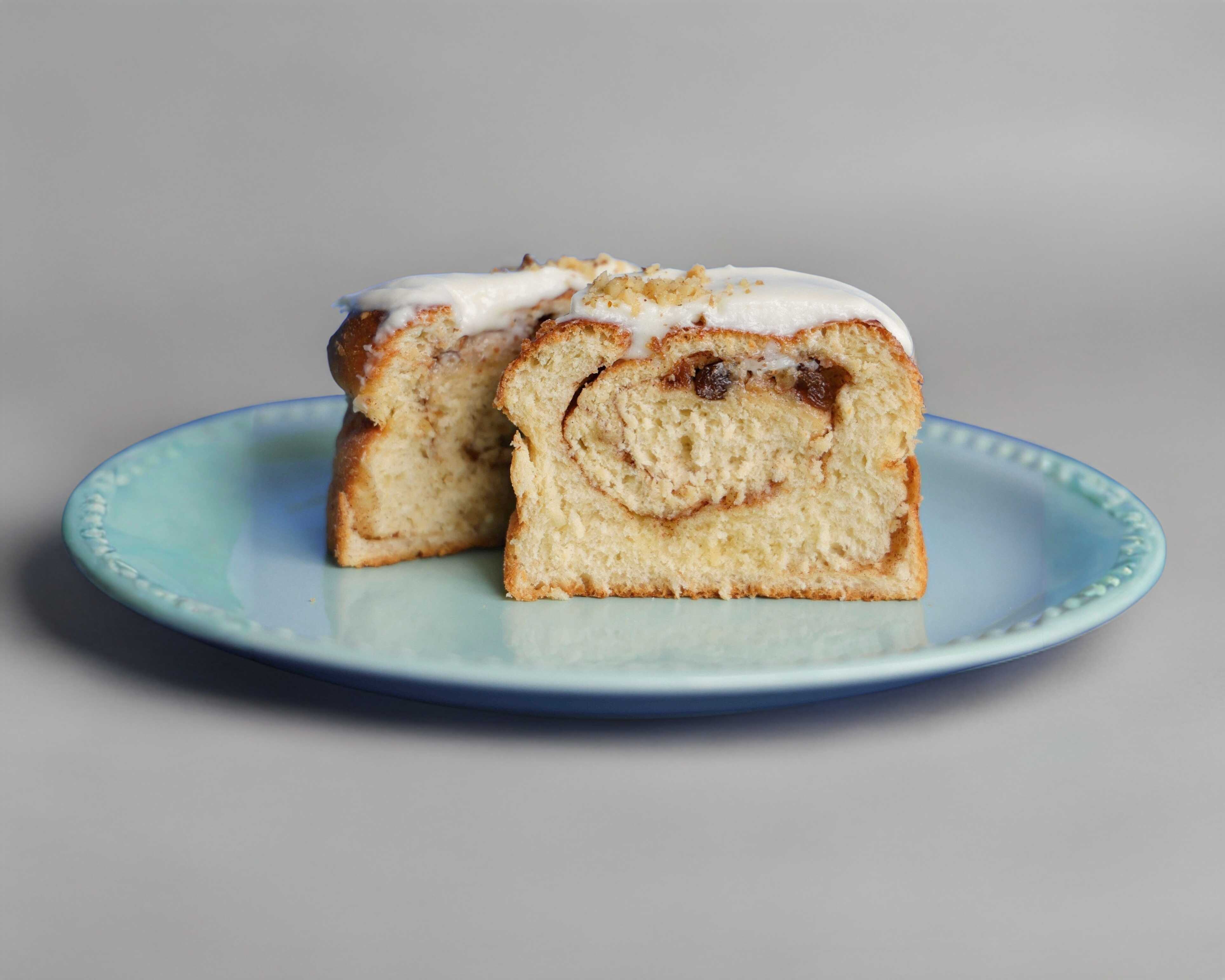Masa suave base mantequilla rellena de azúcar morena y canela, cubierta de glaseado de queso crema.
