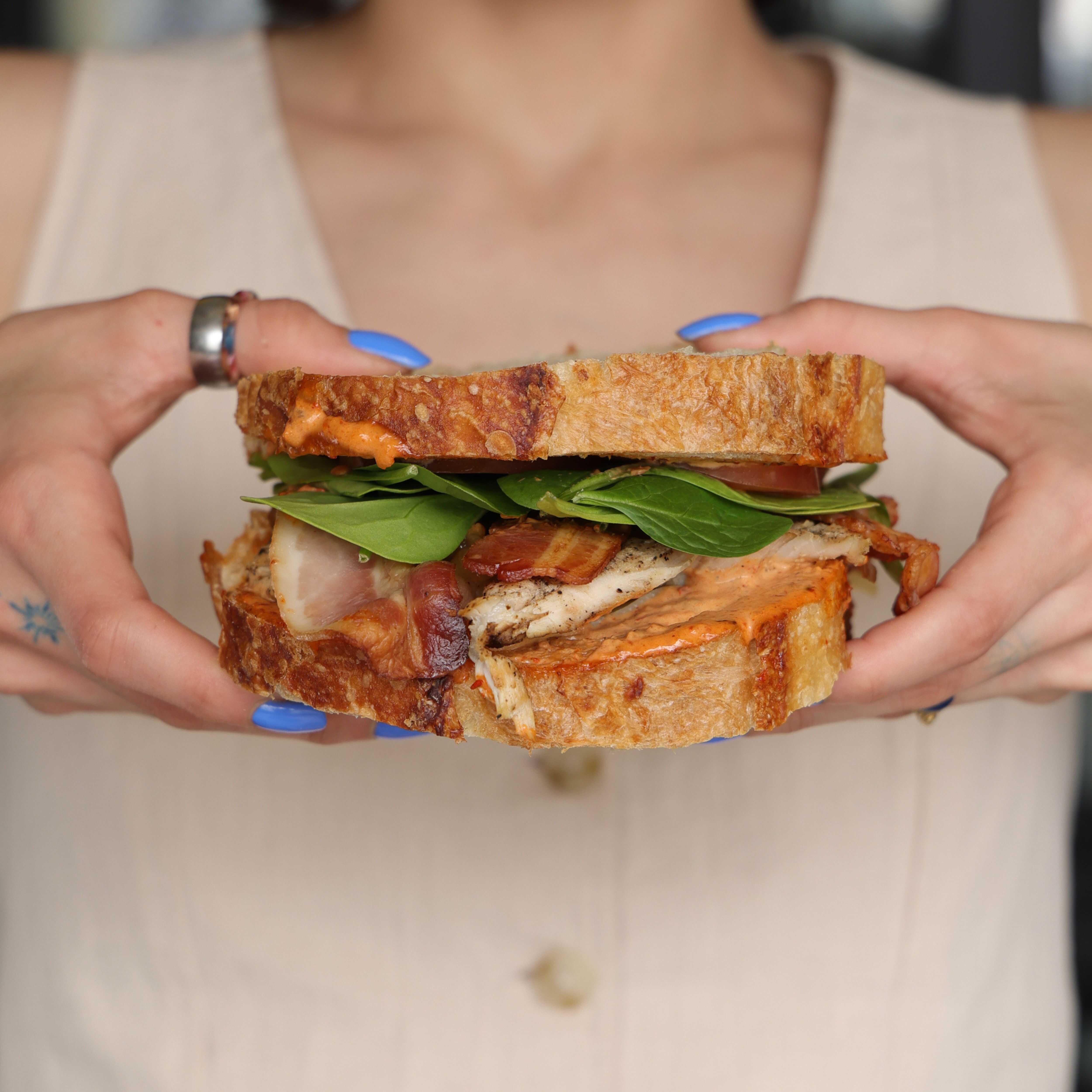 Pan sourdough, mayonesa de chipotle, pechuga de pollo, tocino, cebolla caramelizada y lechuga.