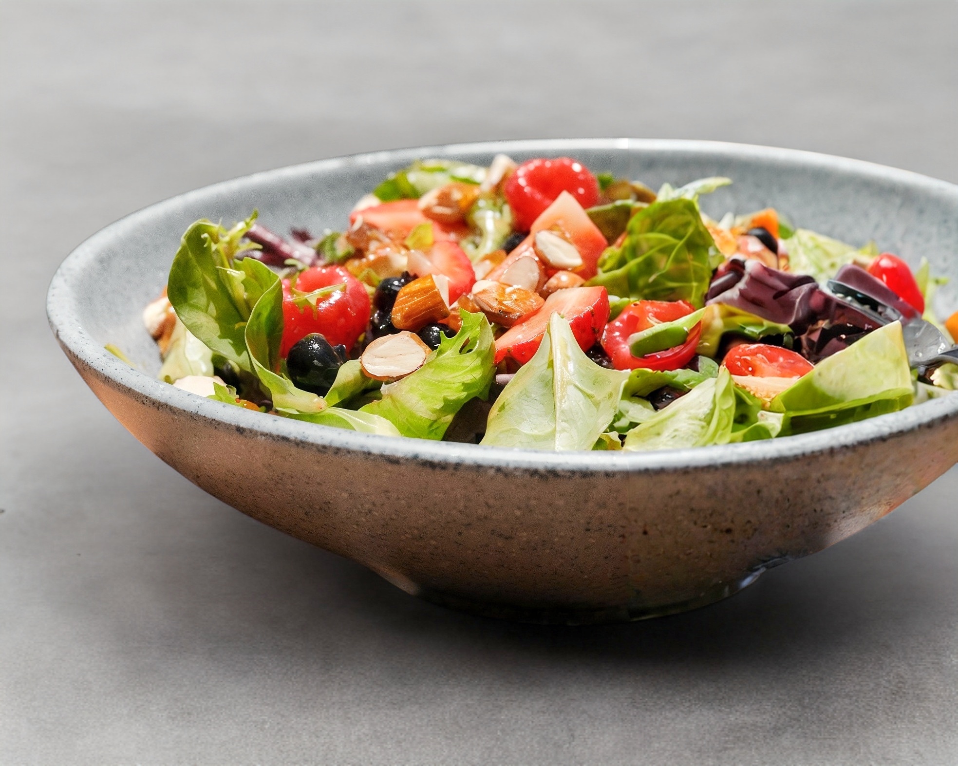 Lechugas mixtas con frutos rojos, queso feta, almendras y pechuga de pollo con aderezo balsámico.