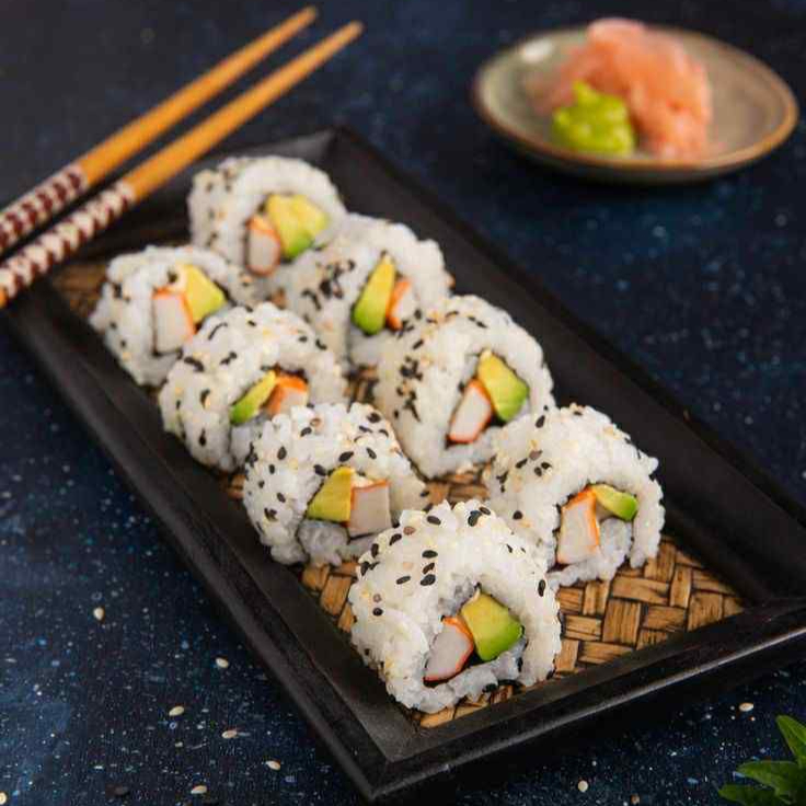 Exquisito rollo de sushi relleno de tsurimi fresco, pepino y queso crema, envuelto en alga y arroz.