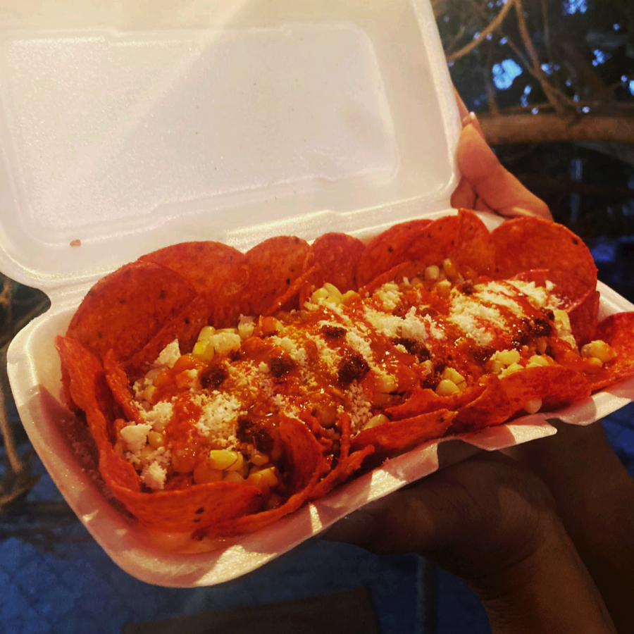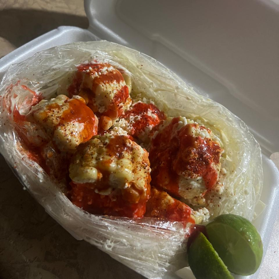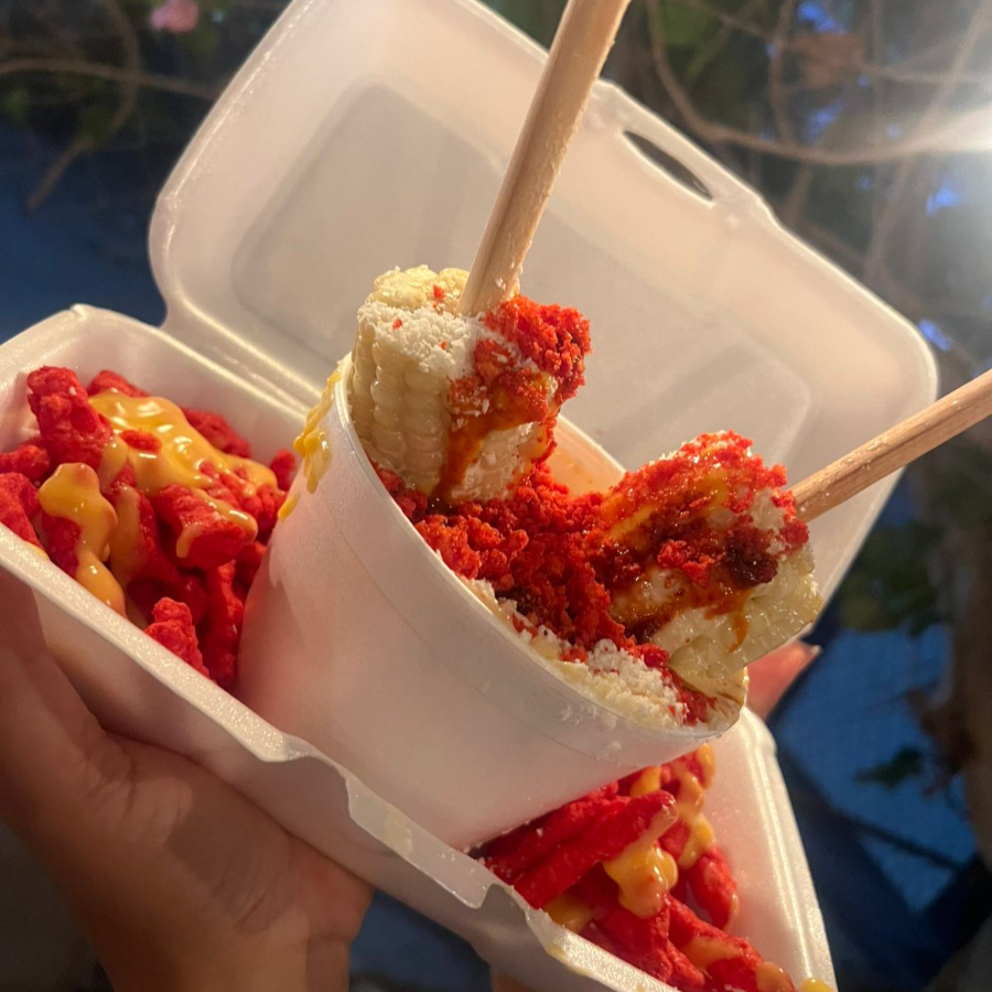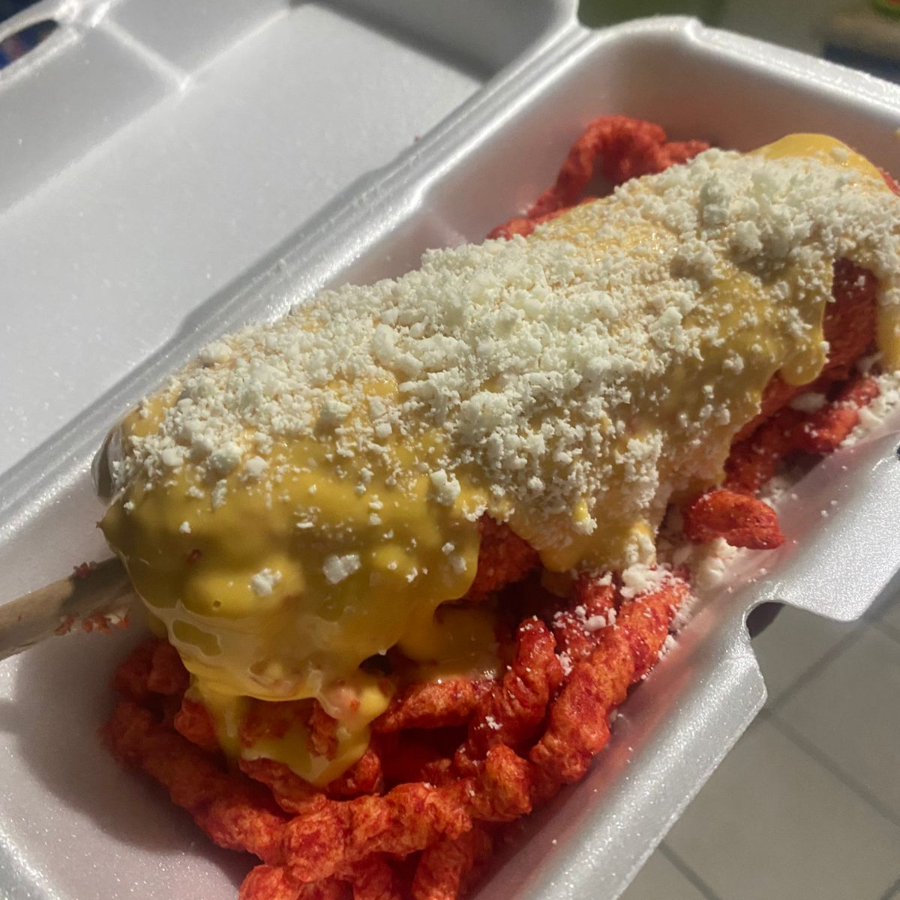 Elote entero preparado con mantequilla, mayonesa y queso; revolcado en polvo de cheetos, cheetos, queso para nachos y chipotle