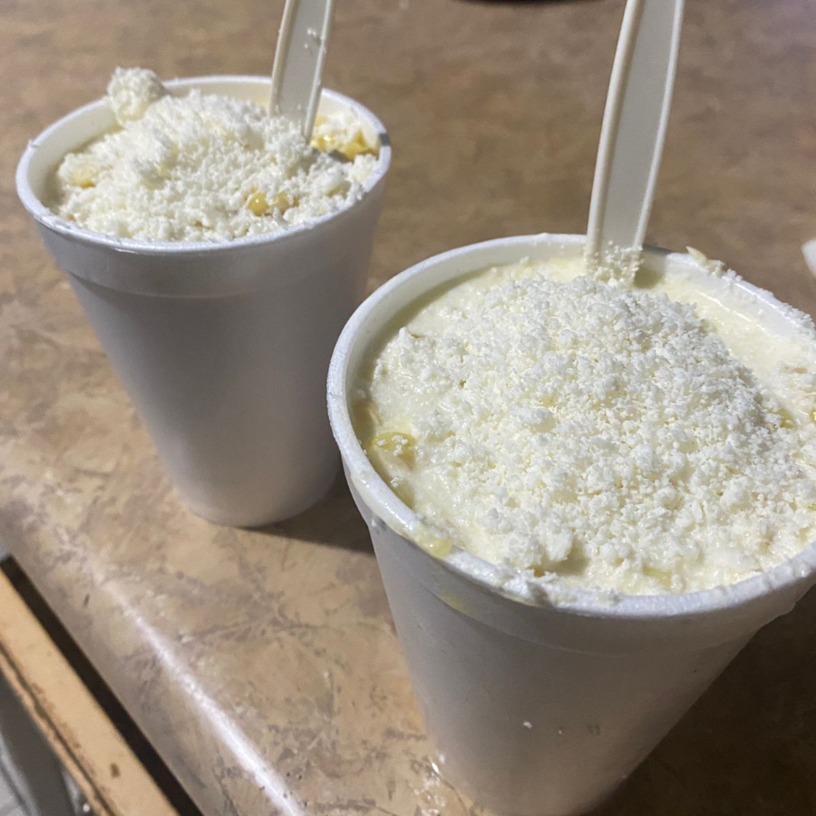 Elote desgranado en su caldo preparado con mayonesa especial, crema y mantequilla. Vaso de 14 oz