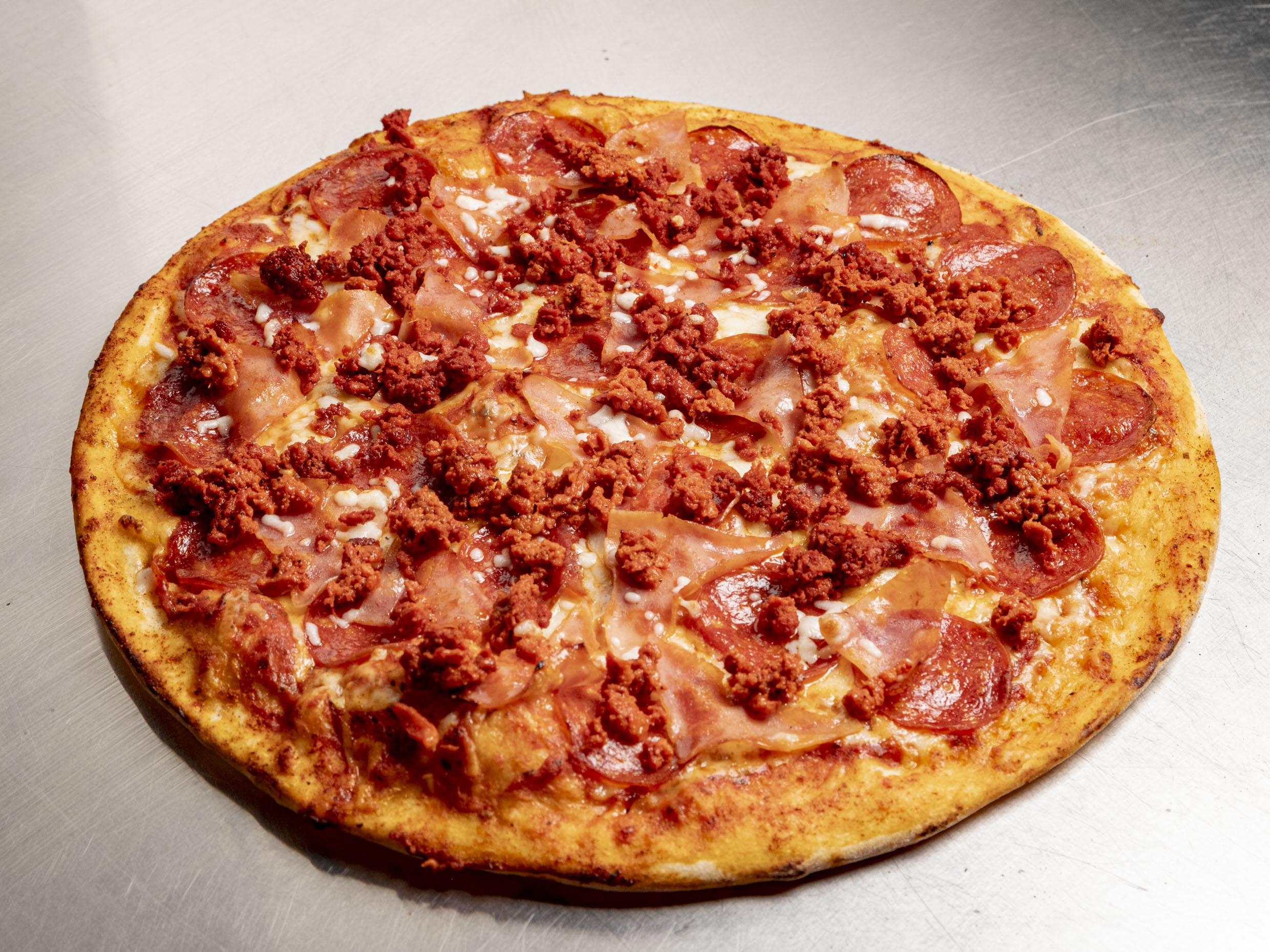 Pizza con salsa de tomate acompañada de queso, pepperoni y chuleta ahumada.