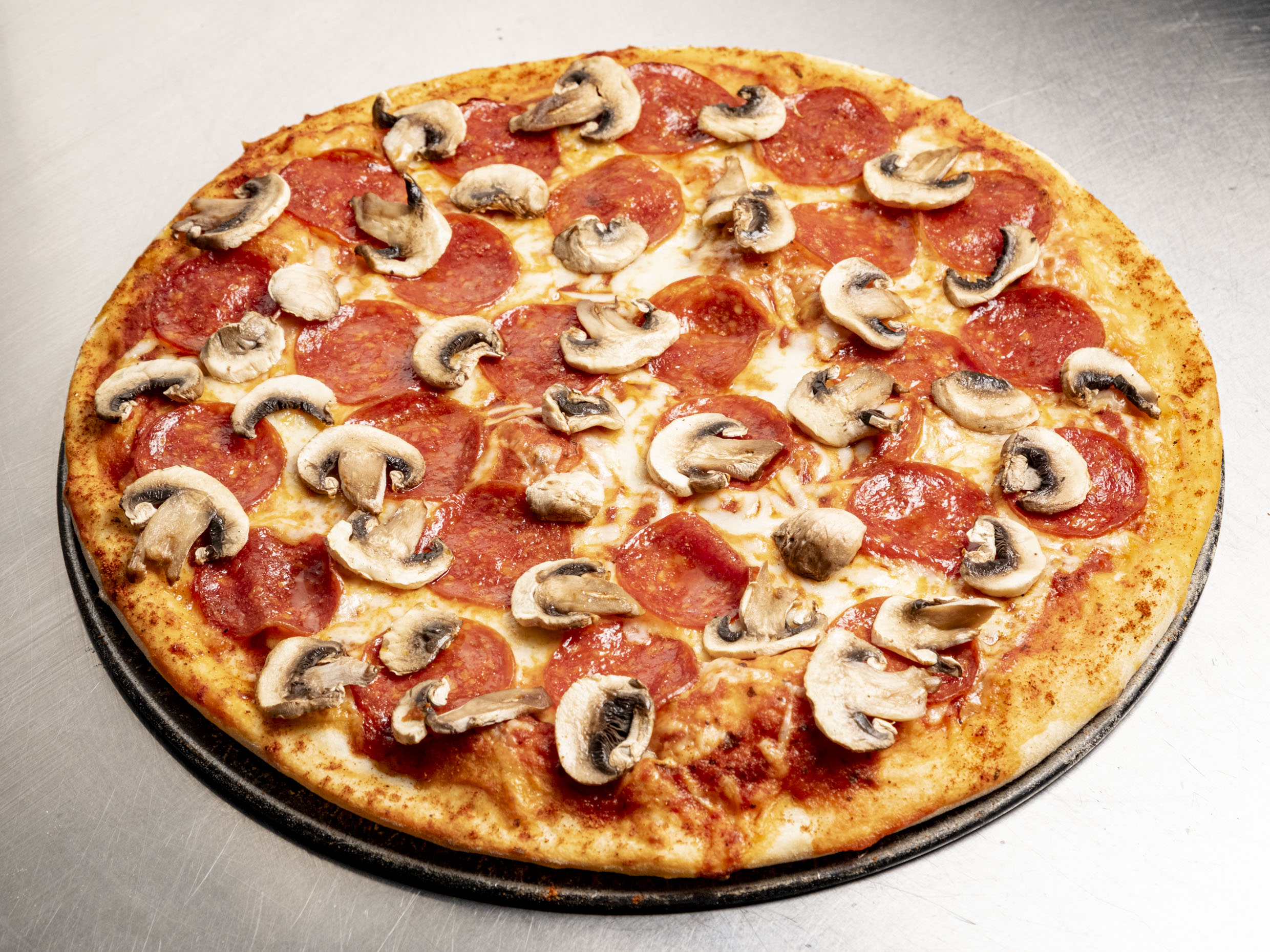 Pizza con salsa de tomate acompañada de queso, champiñón y pepperoni.