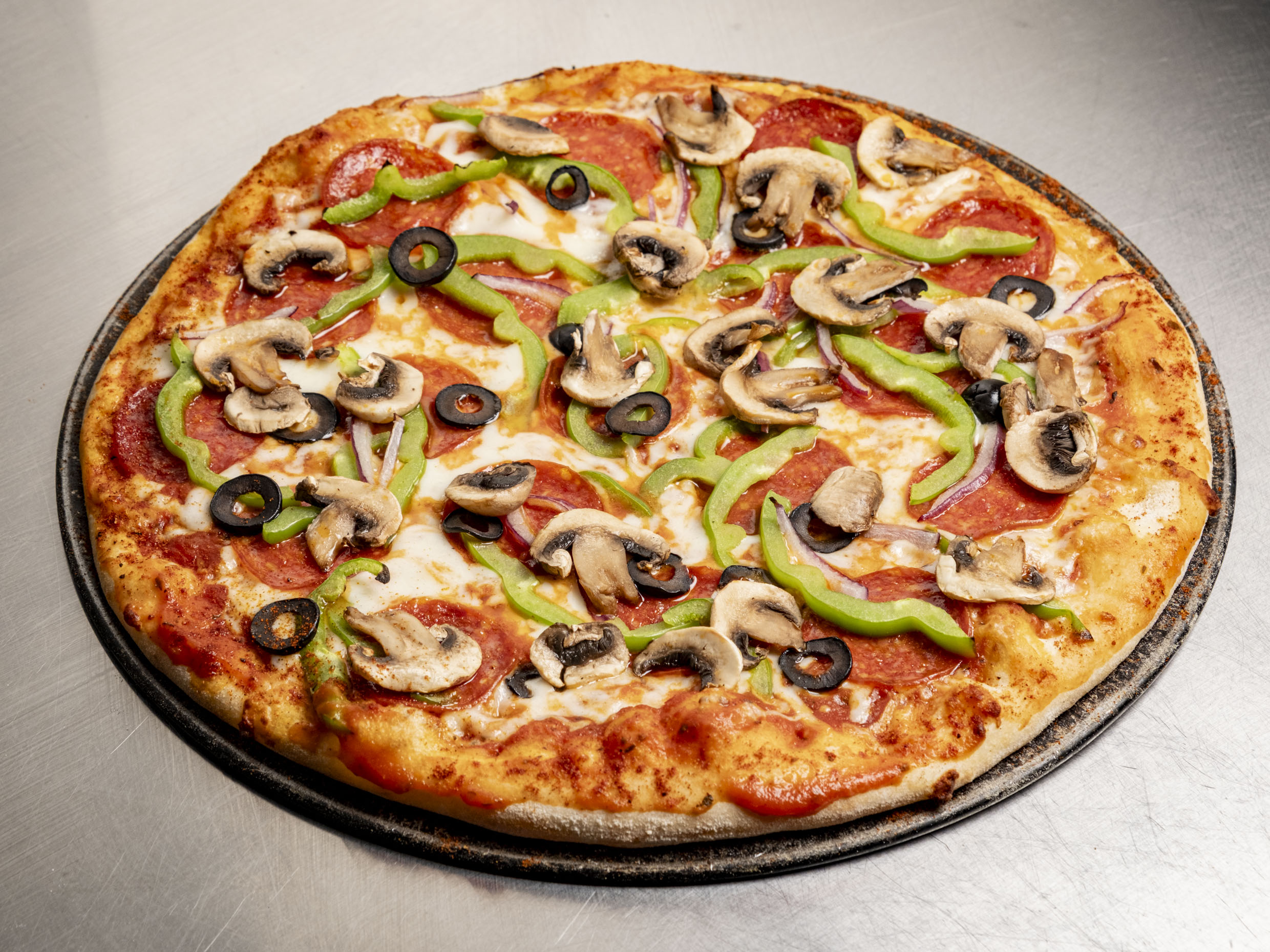 SALSA DE TOMATE, 2 QUESOS, MORRON, CEBOLLA, ACEITUNA, PEPPERONI Y CHAMPIÑON.