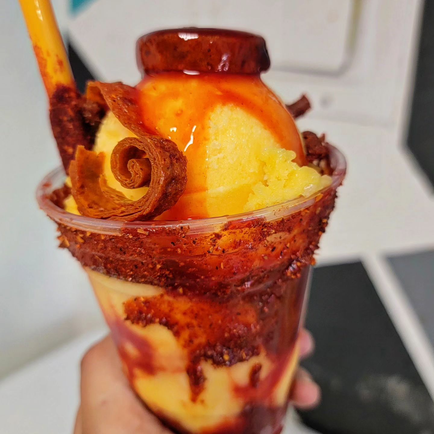 Nieve de mango con limon, trozos de mango, chamoy, dulces de tamarindo. 12oz.