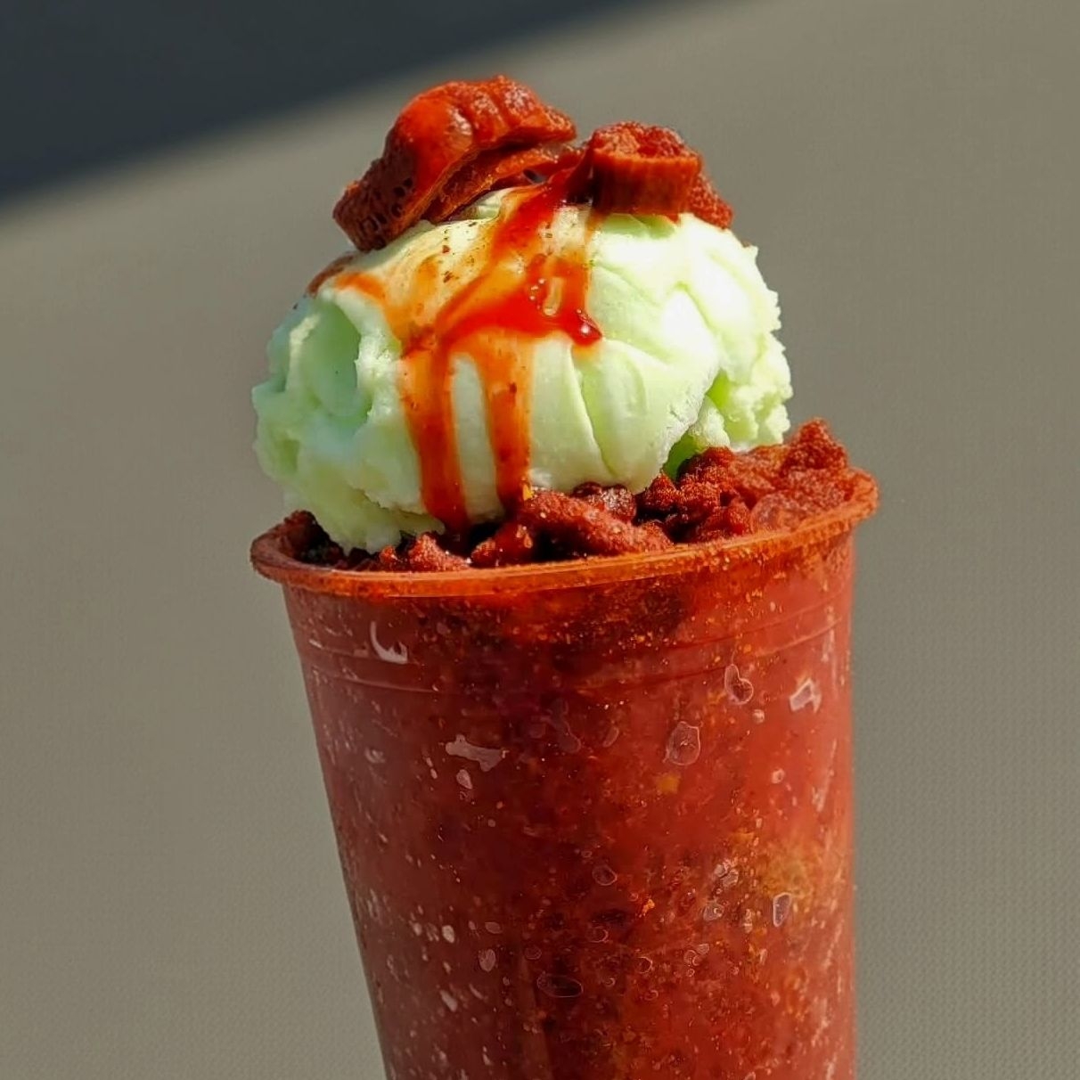Hielo raspado preparado con chamoy agridulce especial, chachaca, nieve de limon con mango.