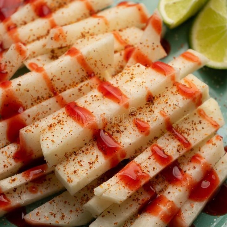 Pepino, jícama, sandía, piña, mango, chile y chamoy. charola chica 7x7 frutas sujetas a temporada.