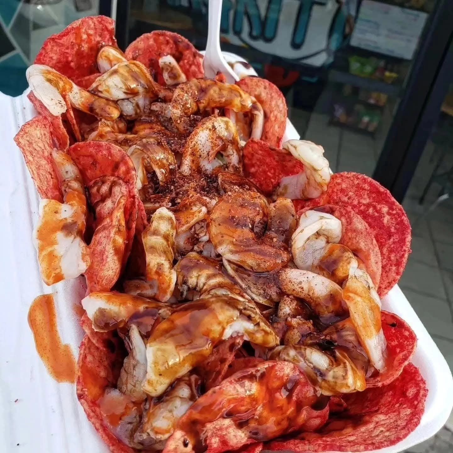 Camarón, pepino, cuerito, cacahuates, chacachaca, gomitas, clamato preparado.