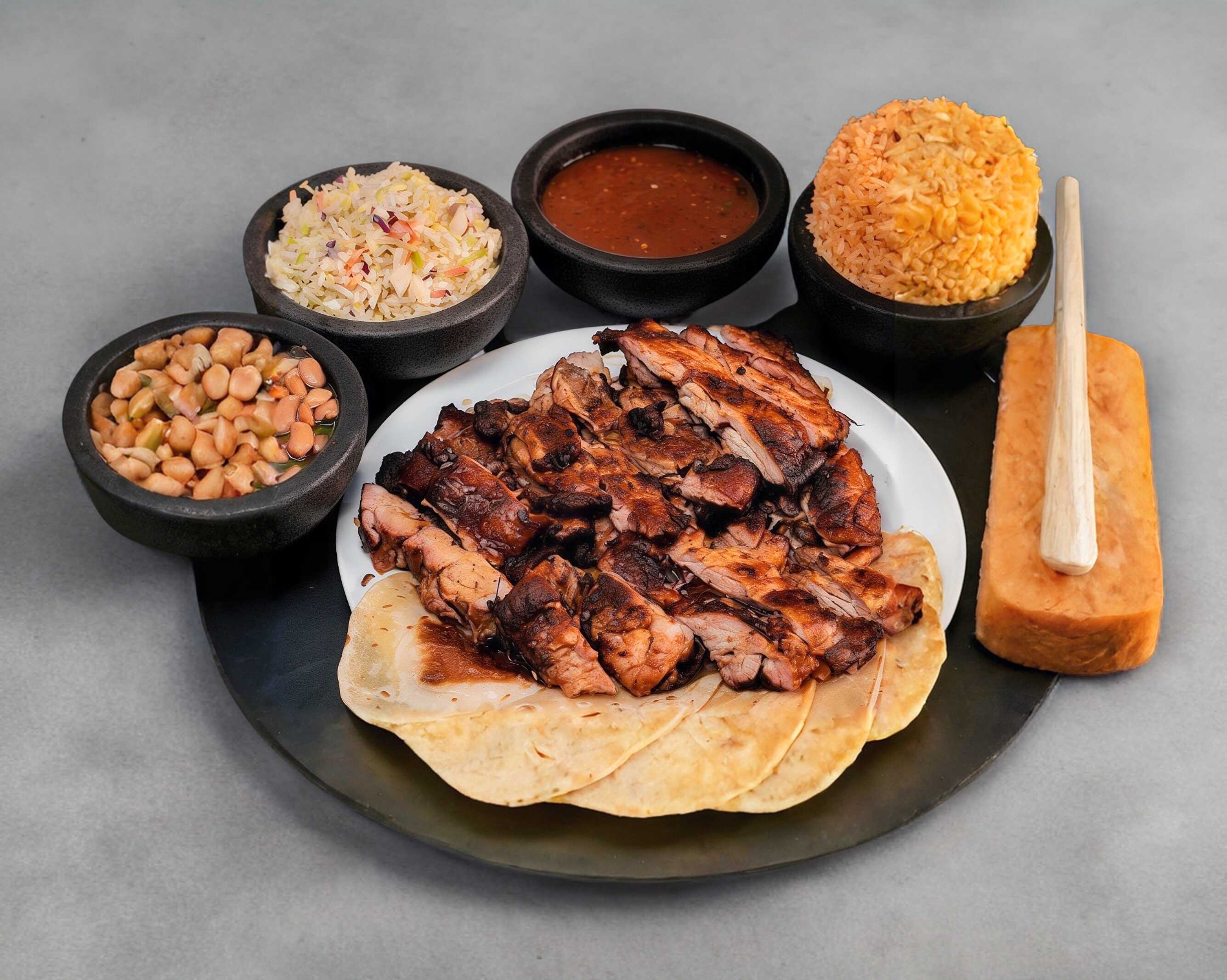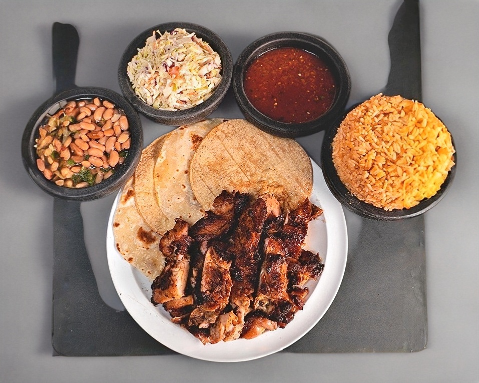 Orden de deshuesado, asado y adobado al carbón acompañado de arroz, ensalada, frijoles, salsa de la casa, tortillas de harina y de maíz.