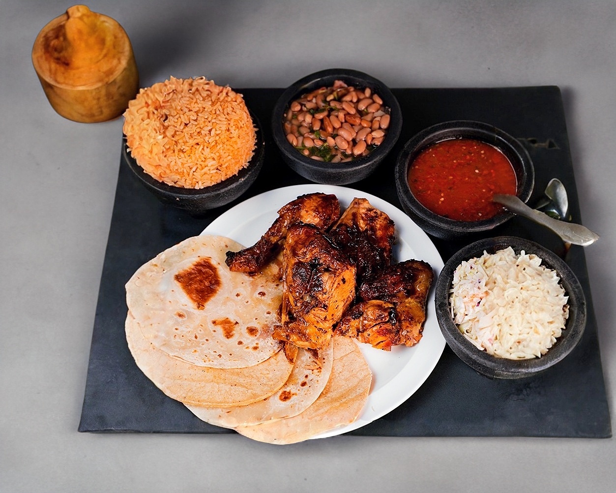 Arroz Rojo*1 + Ensalada*1 + Frijoles de la Casa*1 + Salsa Roja*1 + Tortillas para orden individual (Harina y Maiz)*1 + Pollo (media)*1