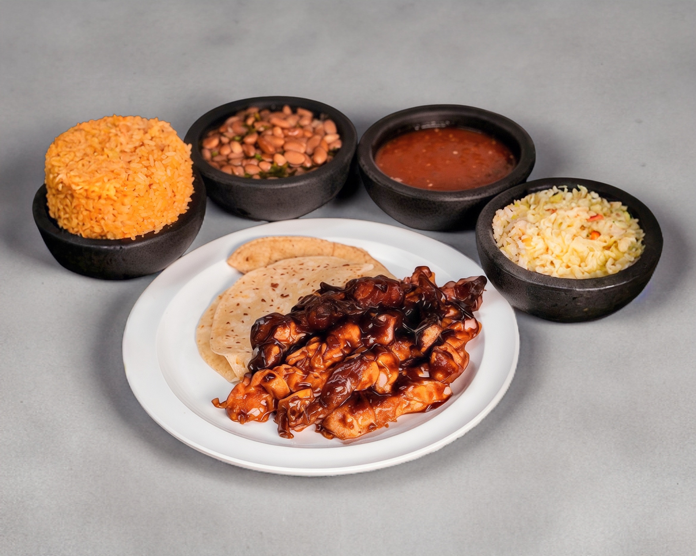 Arroz Rojo*1 + Ensalada*1 + Frijoles de la Casa*1 + Salsa Roja*1 + Tortillas para orden individual (Harina y Maiz)*1 + Pollo*1