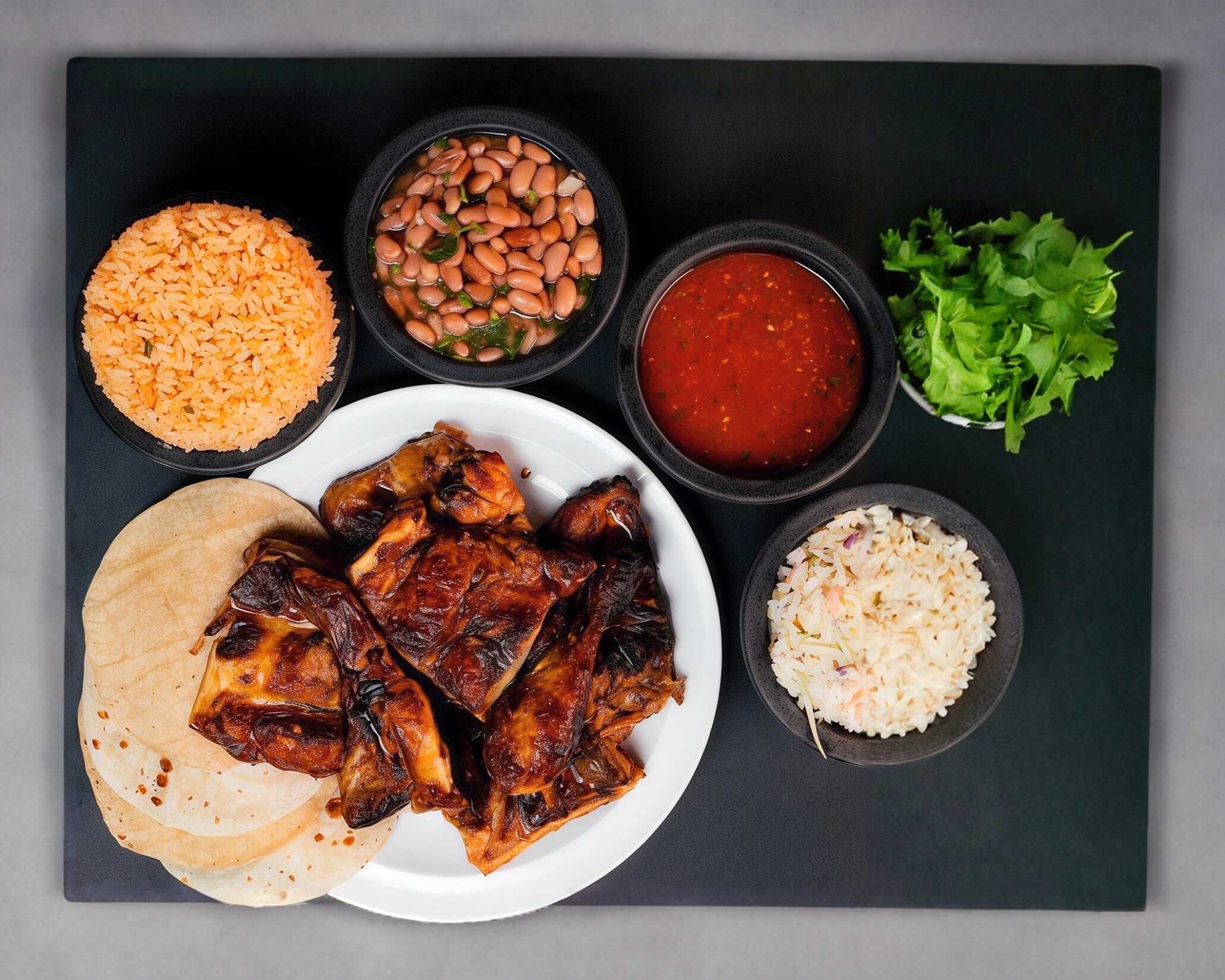 Orden de deshuesado, asado y adobado al carbón en BBQ acompañado de arroz, ensalada, frijoles, salsa de la casa, tortillas de harina y de maíz.