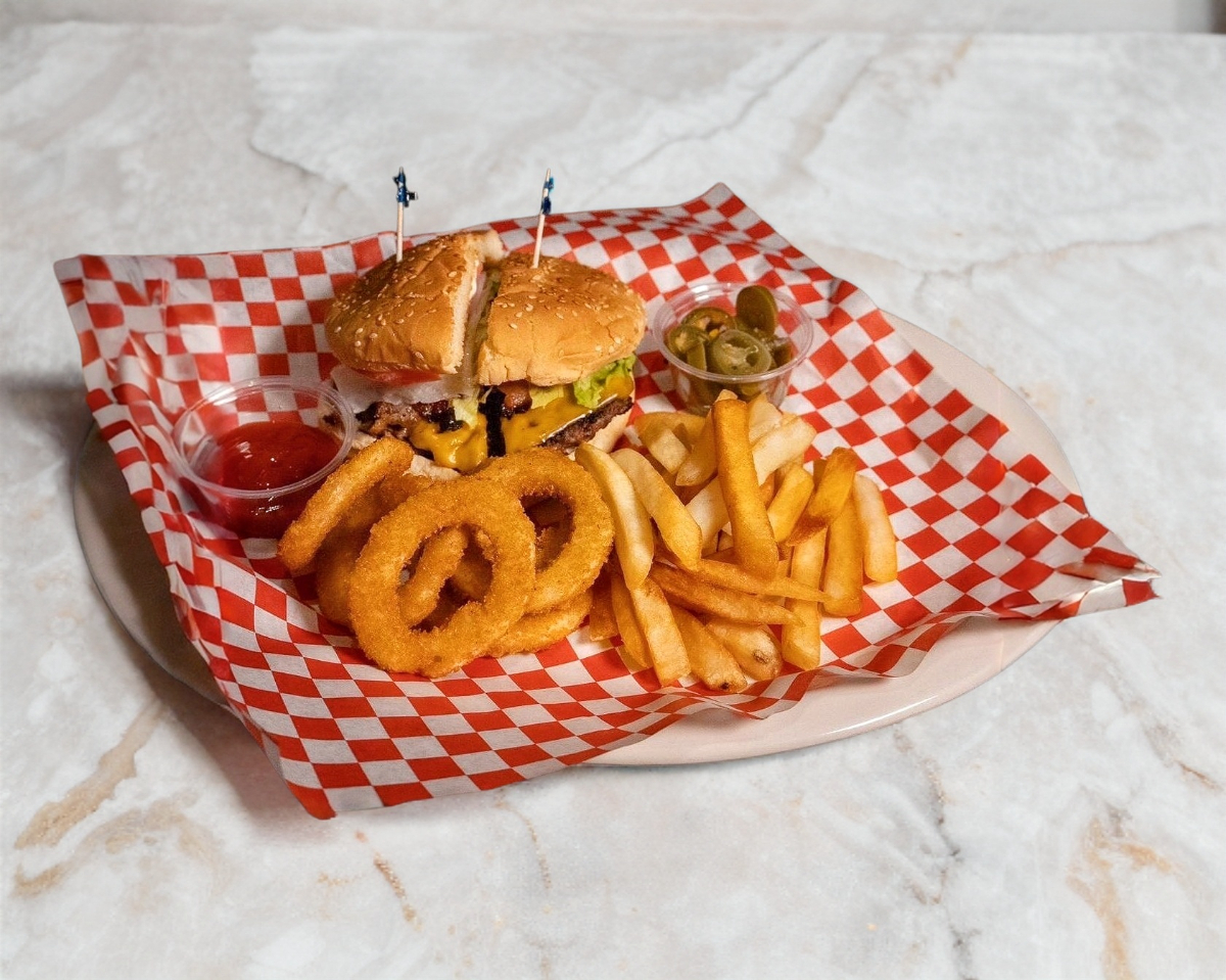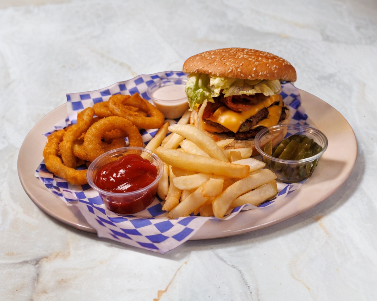 Carne 100% de res preparada con la receta secreta, crujientes rebajadas de tocino,papas fritas y deliciosos aros de cebolla y cremoso dip ranch.