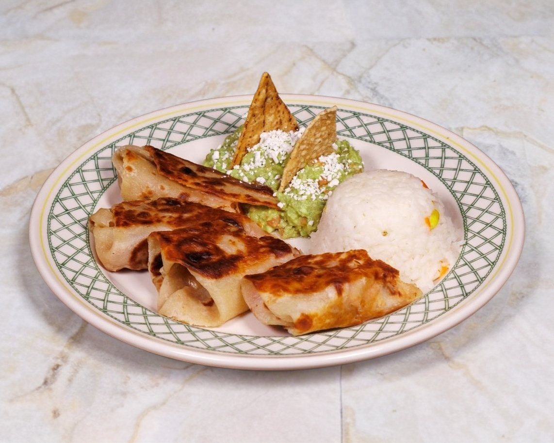 son dos deliciosas chimichangas rellenas de camarón y queso monterrey ranchero. Incluye arroz y guacamole preparado con salsa bandera y salsa picosita.