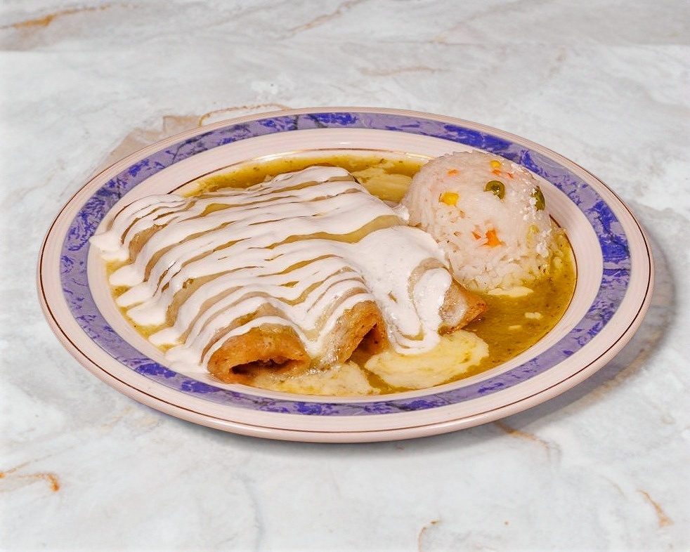 Son 3 enchiladas rellenas de pollo, bañadas en una deliciosa salsa verde queso gratinado acompañadas de arroz blanco.