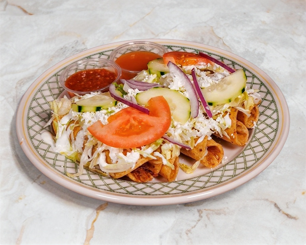 Son 5 taquitos rellenos de carne deshebrada de res cubiertos de lechuga rebanada de tomate y cebolla morada acompañados de salsa caliente de la casa y salsa picosa.